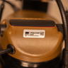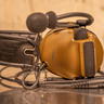 The headset features gel ear cups for increased comfort and a reliable acoustic seal, particularly during extended wear in helmeted or active conditions. It is finished in Coyote Brown and includes two PTT units for selective transmission control across both connected channels. Power is supplied by standard AAA batteries. The unit includes only the headset and two PTTs.