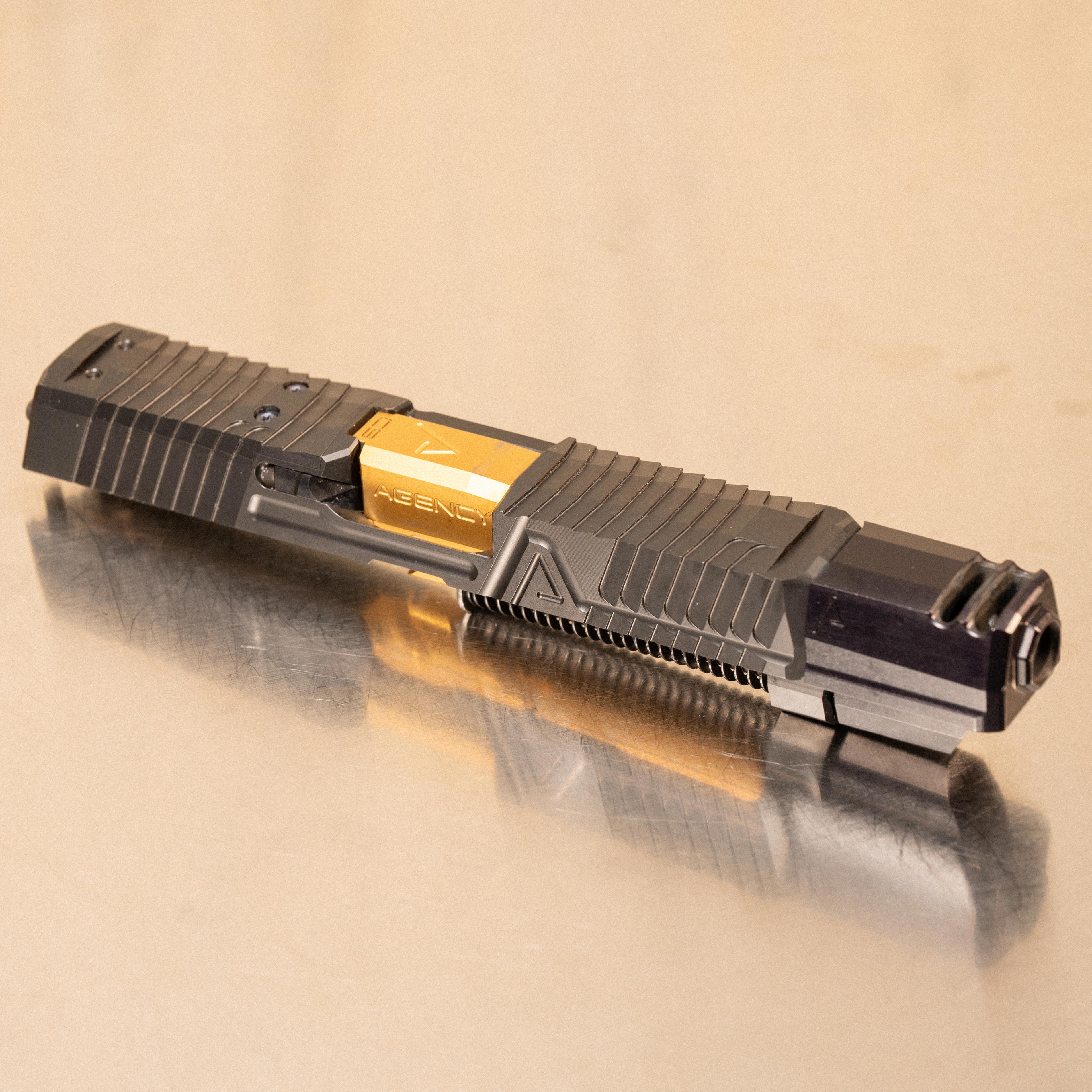The slide is paired with a TiN-coated threaded barrel and a mounted Agency Arms 419 dual-port compensator. This configuration is designed to reduce muzzle rise and improve the return of the firearm during rapid fire. Optics mounting is handled via the Agency AOM system, providing a rigid interface for pistol optics, and this assembly includes an ACRO mounting plate. No additional accessories or original packaging included.