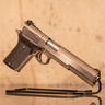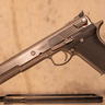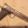 Sights are fixed blade front with a notched rear. The grip panels are checkered black synthetic, secured to the steel frame. Controls include a left-side manual thumb safety and magazine release. Includes one magazine, no original case or accessories.