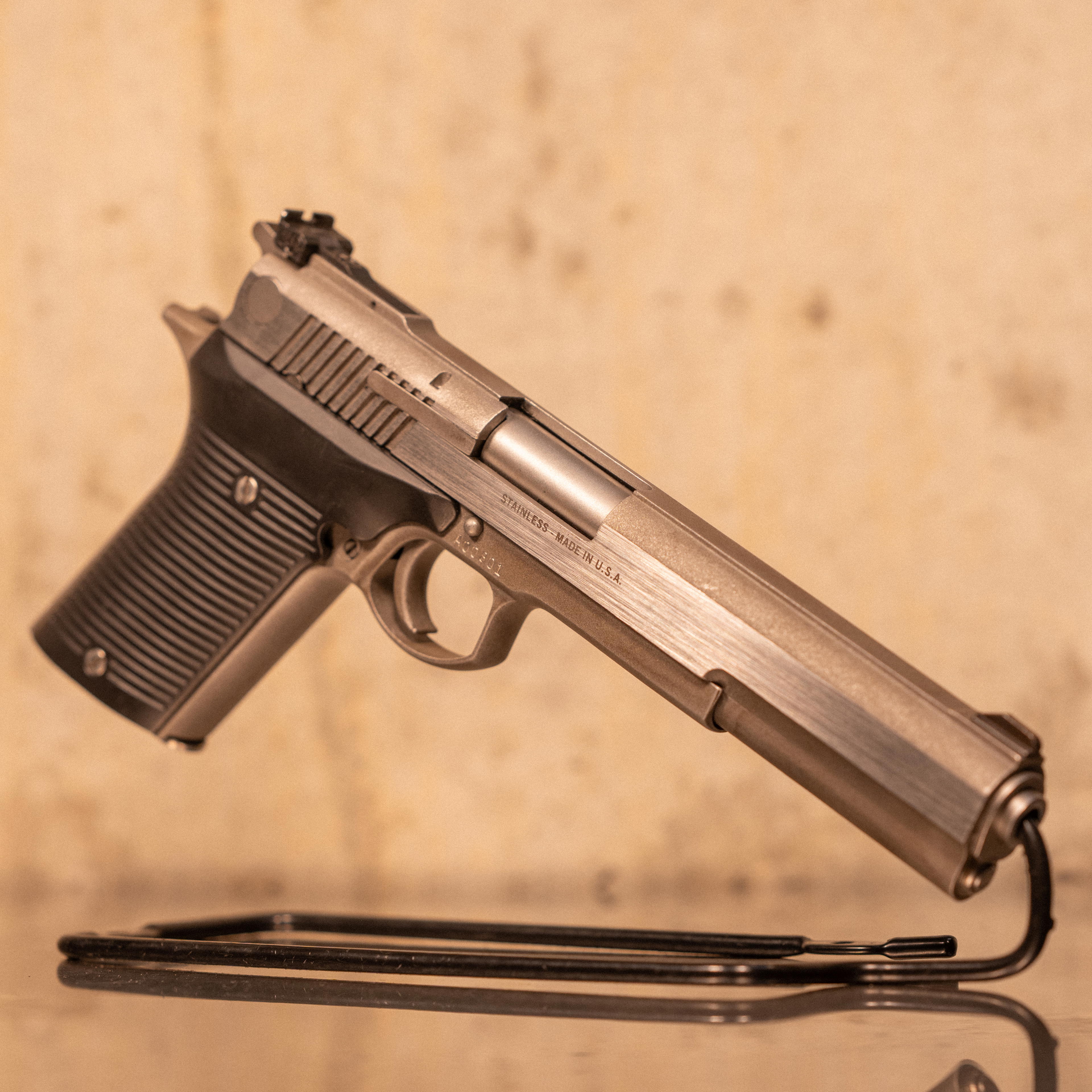 The AMT Automag III is a large-frame semi-automatic pistol chambered in .30 Carbine. It features a 6.5-inch barrel and is constructed entirely from stainless steel, consistent with AMT’s design practice of producing all-metal pistols. Operation is single-action with a short recoil system, using a tilting-barrel lockup.