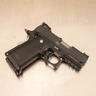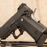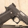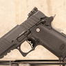 This example features a black PVD finished steel slide and a black anodized aluminum frame, fitted with a checker patterned grip. The frame features ambidextrous thumb safeties, grip safety, as well as an integrated accessory rail for mounting weapon lights. Accompanied by three 16-round magazines and original zip bag.
