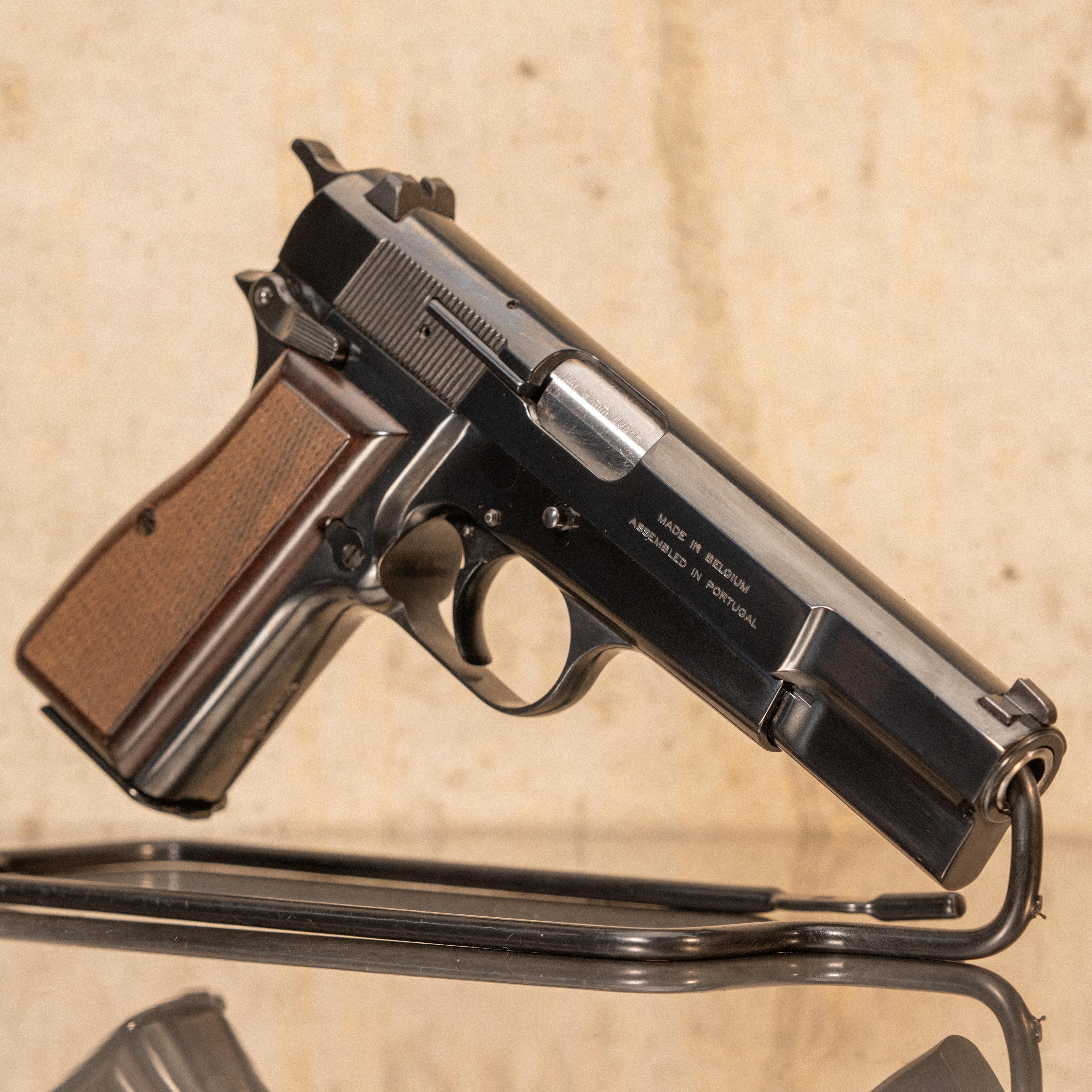 The Hi-Power uses a steel frame and slide with a single action trigger and short recoil locked breech system. The pistol feeds from a double stack magazine and uses a frame mounted thumb safety and external extractor. Late production commercial examples retained the classic profile and control layout associated with earlier Hi-Power pistols.