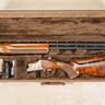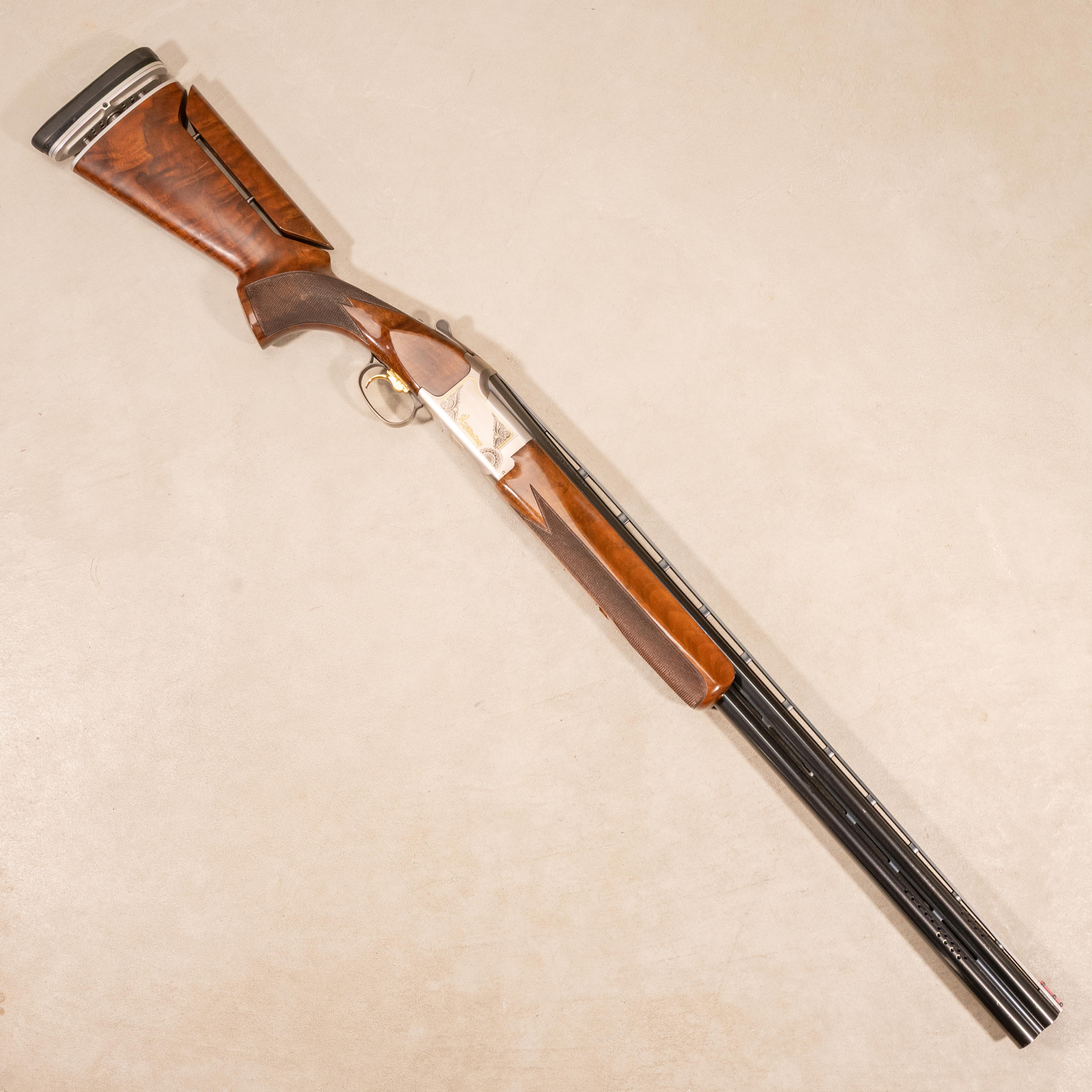 This example is fitted with 28 inch ported barrels with Invector-Plus choke tubes installed in both barrels. The stock is gloss finished walnut with close radius pistol grip, palm swell, cut checkering, a fully adjustable comb for height and cast, and a GraCoil recoil reduction system integrated into the buttstock with an adjustable length of pull spacer system. The fore-end is gloss walnut with a lengthwise recess channel and cut checkering. Accompanied by one additional improved cylinder Invector-Plus choke tube, one extra trigger shoe, barrel weights, a fore-end weight, and a Browning branded locking leather case with fur lined interior.