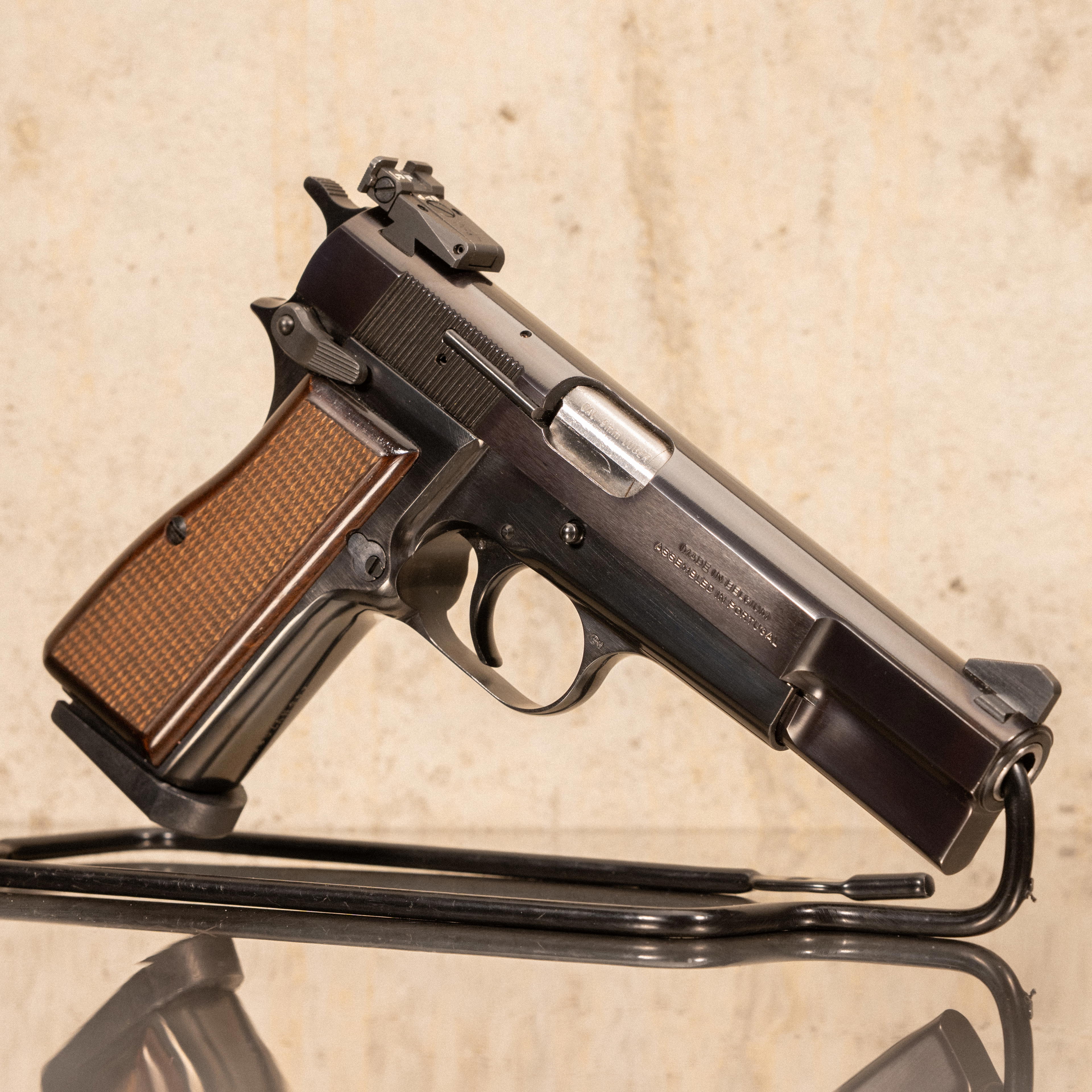 The Browning Hi-Power is a single action semi-automatic pistol designed by John Moses Browning and Dieudonné Saive, originally produced by Fabrique Nationale d'Armes de Guerre (FN) in Herstal, Belgium. It operates on a short recoil, locked breech system with a linkless cam locking arrangement and feeds from a 13-round double stack magazine. The design incorporates a single action trigger, external hammer, frame mounted thumb safety, and magazine disconnect safety. During certain production periods, some Hi-Powers were assembled in Portugal using Belgian manufactured components, maintaining the same parts and production standards as fully Belgian assembled examples.