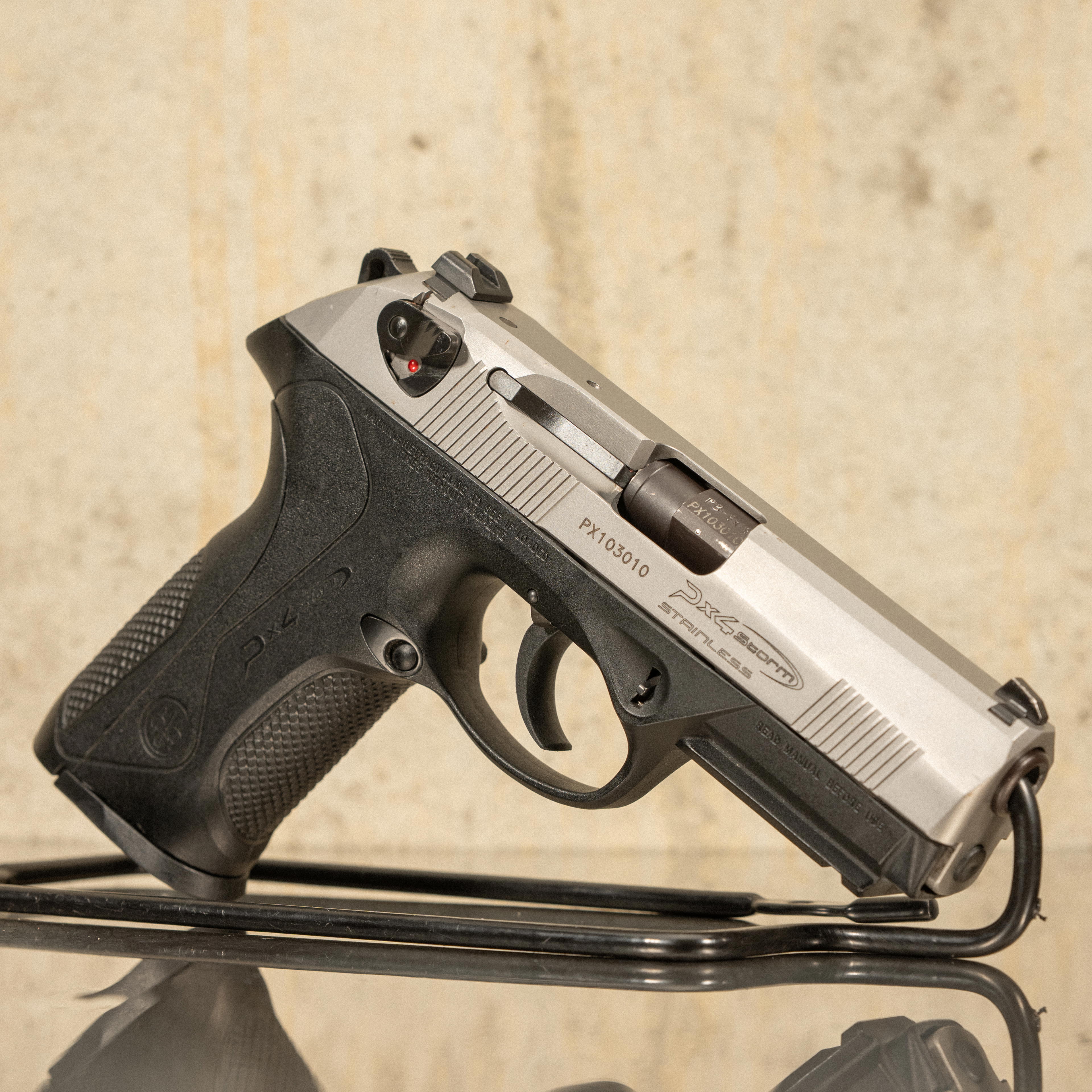 The full size PX4 incorporates ambidextrous slide mounted safety/decocker levers, a reversible magazine release, and a double action/single action trigger system. The rotating barrel mechanism and open internal slide geometry differentiate the PX4 from many other contemporary service pistols. This example uses a stainless Inox slide paired with a black polymer frame and black barrel, creating the distinctive two tone stainless configuration associated with the Inox variant. No original box or accessories included.