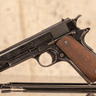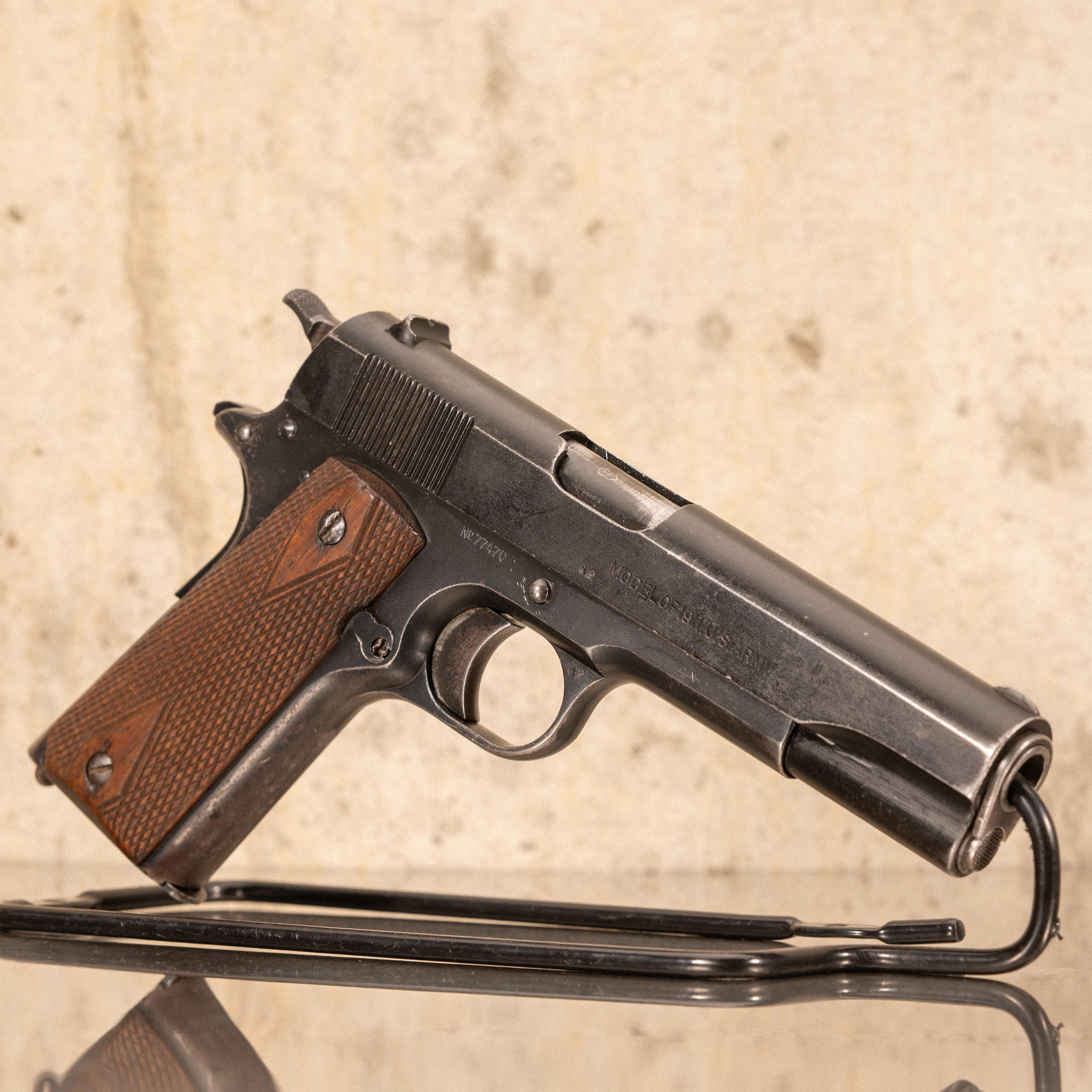 The M1911 is a single action, semi automatic pistol chambered in .45 ACP, designed by John Moses Browning and adopted by the United States military in March of 1911. The pistol operates on a short recoil, locked breech system using a swinging link beneath the barrel to cam the barrel down and out of engagement with the slide after firing. A barrel bushing at the muzzle end of the slide centers and guides the barrel during cycling. Early production M1911 pistols feature a flat mainspring housing, long trigger, small grip safety, checkered thumb safety, checkered guide rod plug, checkered slide stop, and a checkered wide spur hammer. The frame incorporates a lanyard loop at the base of the mainspring housing. Military M1911 pistols bear "UNITED STATES PROPERTY" on the left side of the frame and "MODEL OF 1911. U.S. ARMY" on the right side of the slide. Standard military grip panels were checkered walnut with double diamond reinforcement patterns surrounding the grip screw escutcheons.