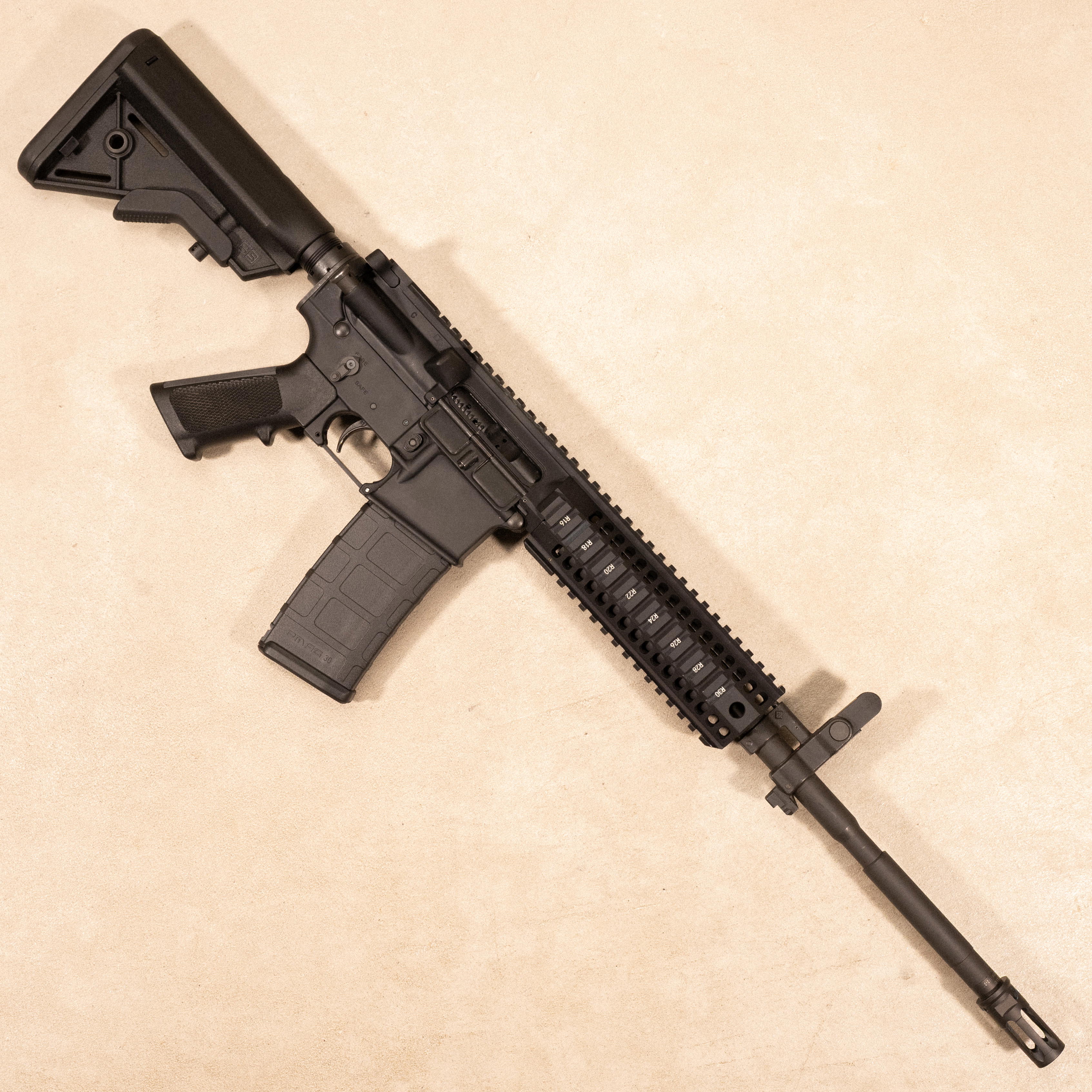 This example is configured with a B5 Systems buttstock, A2 pistol grip, and a SureFire closed tine Warcomp flash hider and compensator in place of the standard Colt A2 flash hider. The monolithic upper features the factory folding front sight and a flat top Picatinny rail for optics mounting. Accompanied by one 30-round Magpul PMAG. No original box or accessories included.