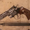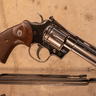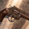 Sights consist of an adjustable rear with a red-ramp front blade. The full-lug barrel profile adds weight forward of the frame to reduce muzzle rise and aid stability during firing. Operation is double-action or single-action with a six-round fluted cylinder. Factory-fitted walnut target grips with Colt medallions are installed. This model is compatible with both .357 Magnum and .38 Special cartridges.