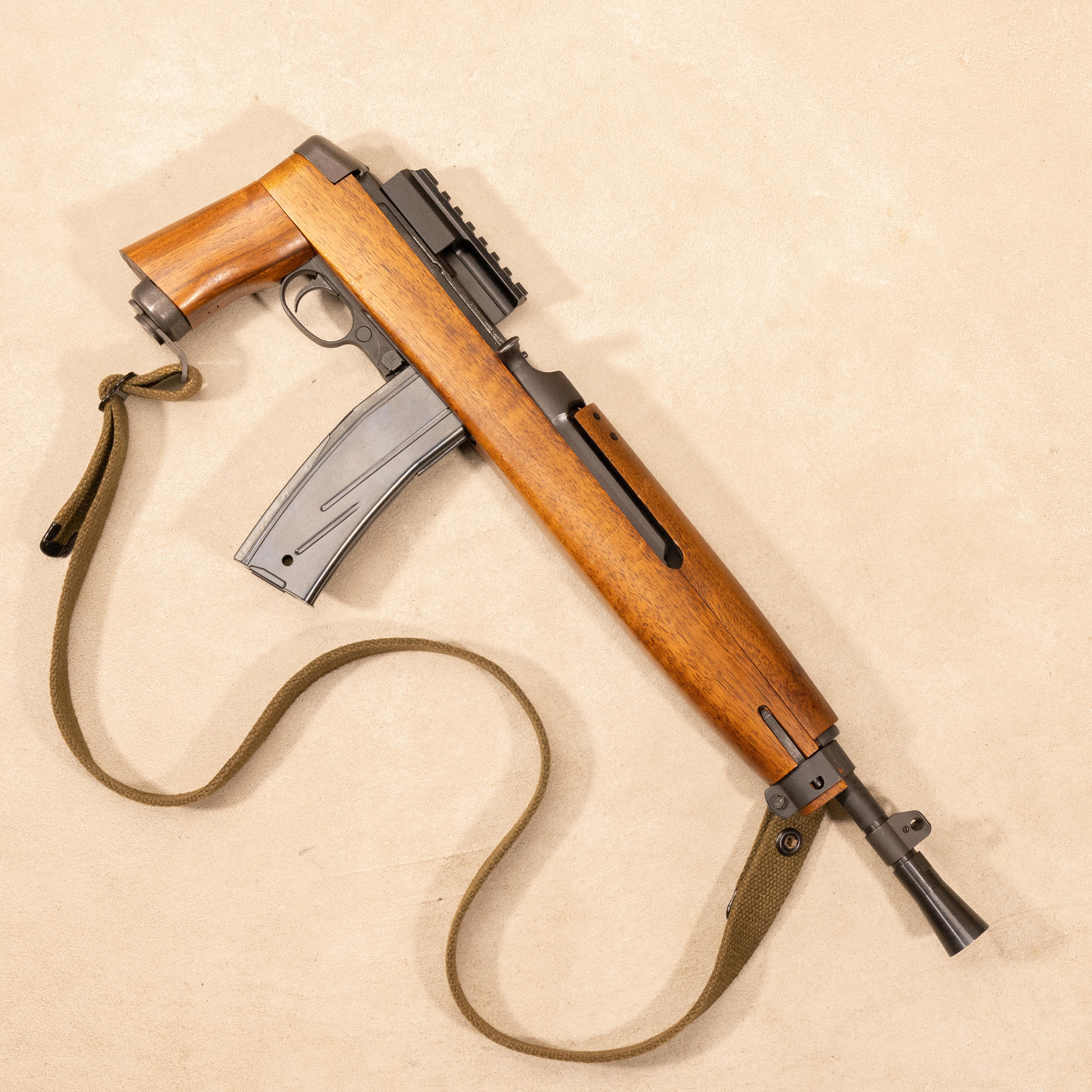 This example is equipped with an S&K Insta Mount Picatinny rail installed at the rear sight dovetail, providing a standard optics mounting platform without any permanent modification to the receiver (no drilling or tapping required). The rear of the receiver is configured to accept a folding wire stock similar to the M1A1 Paratrooper pattern, for ease of SBR conversion if desired. The pistol is accompanied by a sling and one 30-round magazine. No original box or additional accessories included.