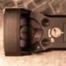 The housing is machined from aluminum with a steel shielded hood for impact resistance. The unit is waterproof to 33 ft (10 m) and shock resistant for repeated firing cycles. Windage and elevation adjustments are made in 1 MOA increments. Power is supplied by a single CR2032 battery, with a runtime of approximately 300 hours on high or 1,600 hours on medium, extended through the motion-sensing system.