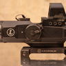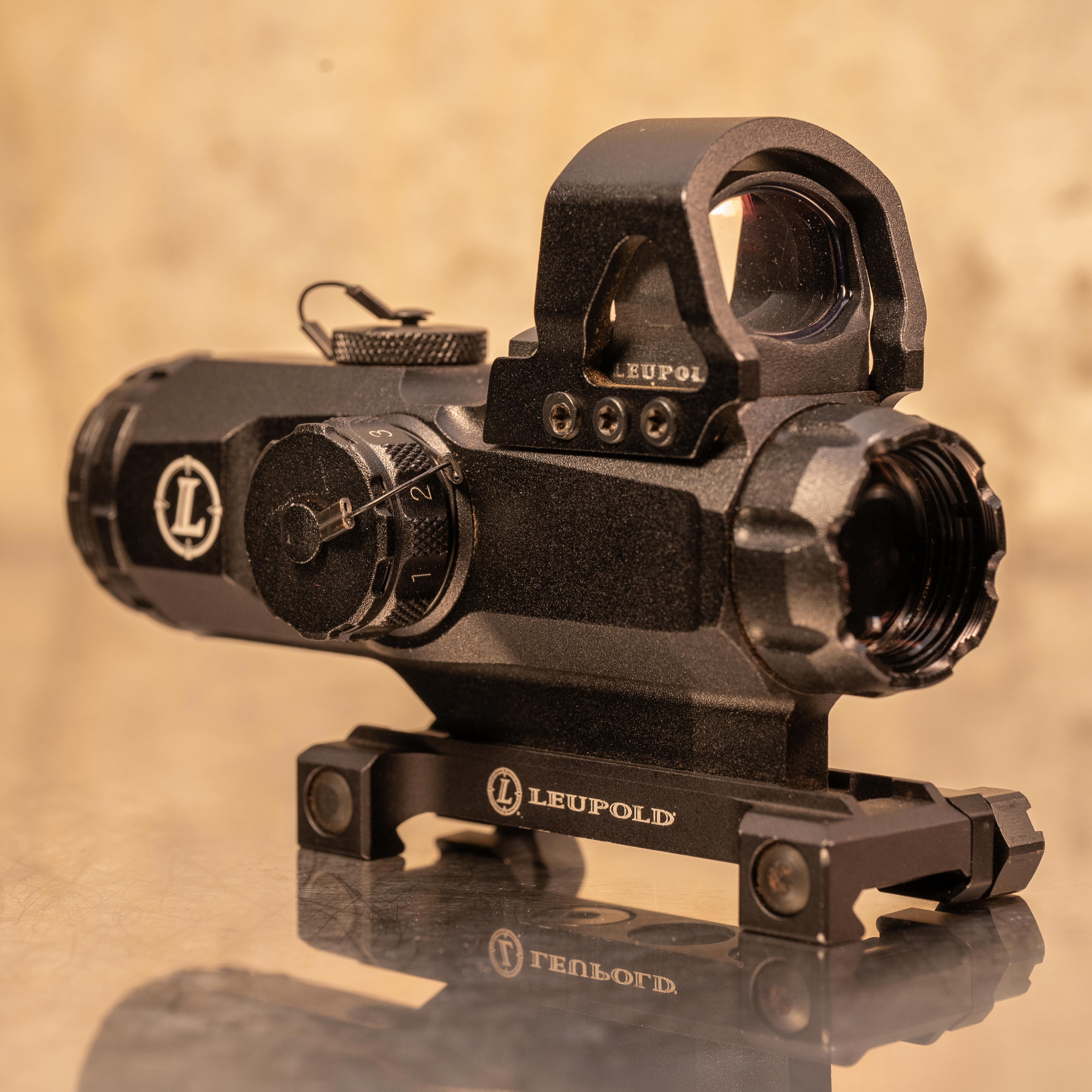 Mounted above the primary optic is a Leupold DeltaPoint reflex sight with a 7.5 MOA triangle red dot, providing rapid sight acquisition at short distances without altering the firing position. This combination allows the shooter to engage across multiple ranges with minimal transition time. The system mounts directly to standard Picatinny-style rails via the included integral base. No original packaging or accessories included.