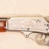 In 1985, Marlin produced the Model 1895 Century Limited as a commemorative edition limited to 2,500 rifles, manufactured to mark two milestones simultaneously: the 125th Anniversary of The Marlin Firearms Company (founded 1870) and the 100th Anniversary of the Model 1895 (introduced 1895). The Century Limited is distinguished by its engraved silver finished receiver and lever, contrasted by a blued half octagon/half round barrel and black hammer. The left side of the receiver is engraved "Model 1895 100th Anniversary," while the right side features scroll and floral engraving reading "Marlin Firearms Co 125th Anniversary" surrounding a central scene depicting two bears over mountains within a framed vignette. The rifle is fitted with a walnut straight grip stock with a commemorative medallion inlaid on the right side of the buttstock and a brass crescent buttplate. Sights consist of a semi buckhorn rear sight and a brass bead front sight. This example is in like-new condition with its original box and manual.