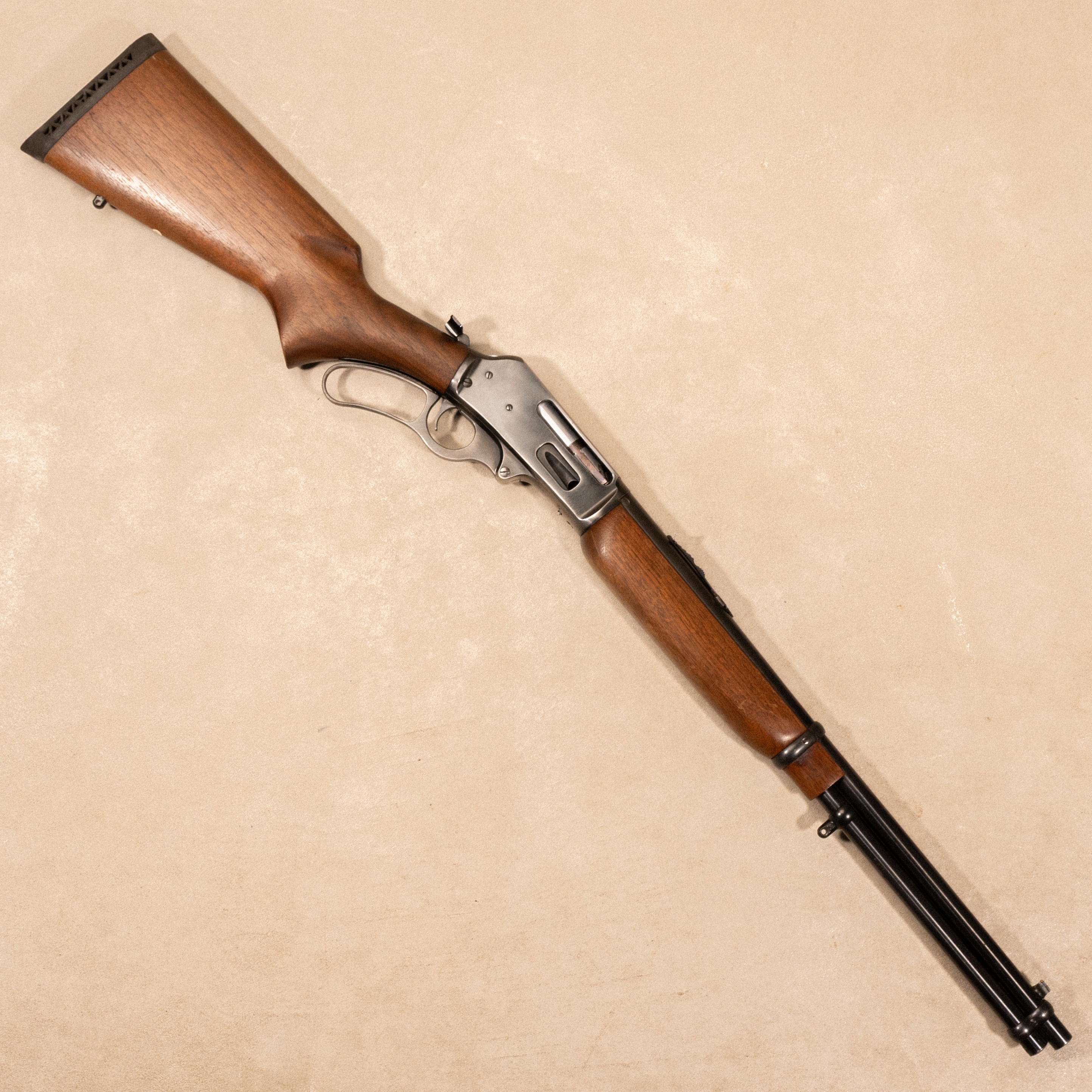 The 336 R.C. (Regular Carbine) designation identifies the standard carbine configuration fitted with a 20 inch barrel and full length tubular magazine. This example is chambered in .30-30 Winchester and features a blued steel barrel, walnut stock and fore-end, and the traditional open sights associated with the model. The bolt body is jeweled and the rifle retains the classic lever action configuration typical of early Model 336 carbines. Accompanied by Marlin rifle bag.
