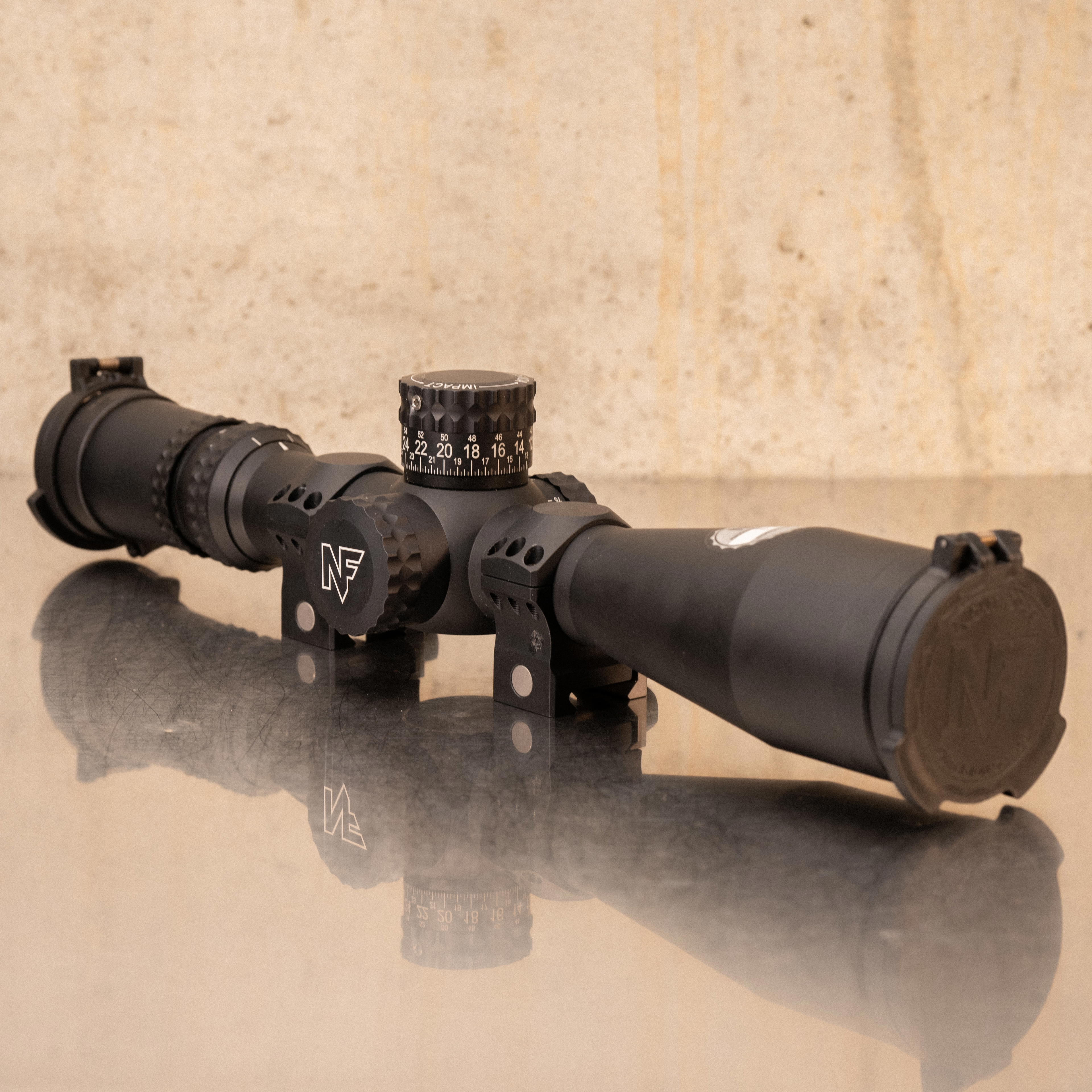 This example is mounted in Nightforce Ultralite 34mm six screw rings in the high height configuration (1.125"). These rings are machined from aluminum and designed to provide a lightweight but rigid mounting solution for precision optics. The six screw cap design distributes clamping force evenly around the scope tube while maintaining a low profile mounting interface compatible with Picatinny rails. Original box and accessories included.