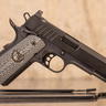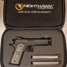 This configuration uses a match grade 5 inch threaded barrel with a knurled thread protector and suppressor height night sights, providing a usable sight picture with or without a mounted suppressor. The pistol is equipped with an ambidextrous manual thumb safety, aggressively textured G10 grip panels, and includes factory Nighthawk branded soft case, as well as two magazines.