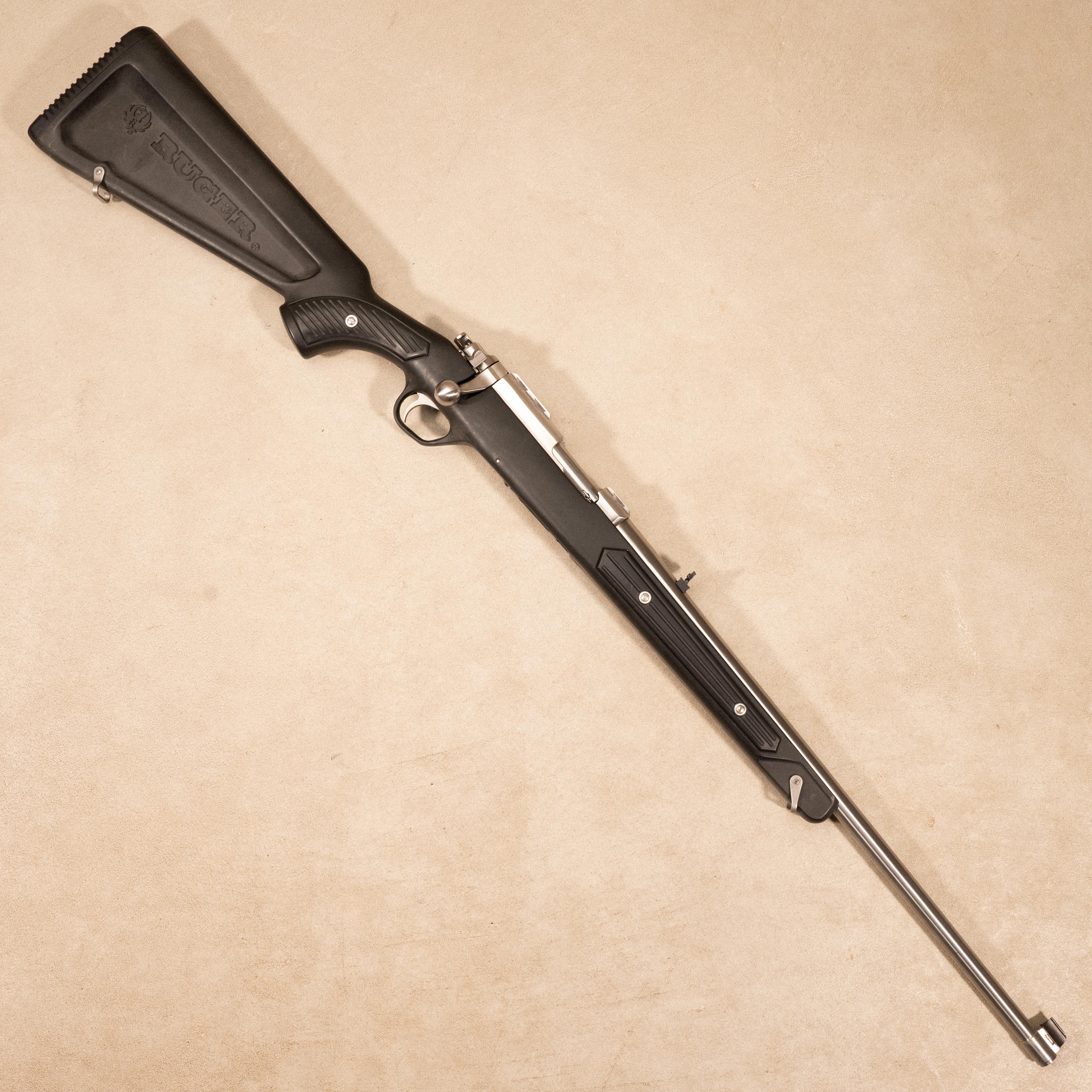 This example is chambered in .22 WMR and is configured with a stainless steel barreled action paired with a Zytel synthetic stock, a glass fiber reinforced nylon construction with a distinctive checkering pattern, also known as the "boat paddle" stock. The rifle is equipped with a blade front sight and a flip up buckhorn rear sight. Accompanied by one detachable rotary magazine. No original box or accessories included.