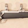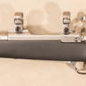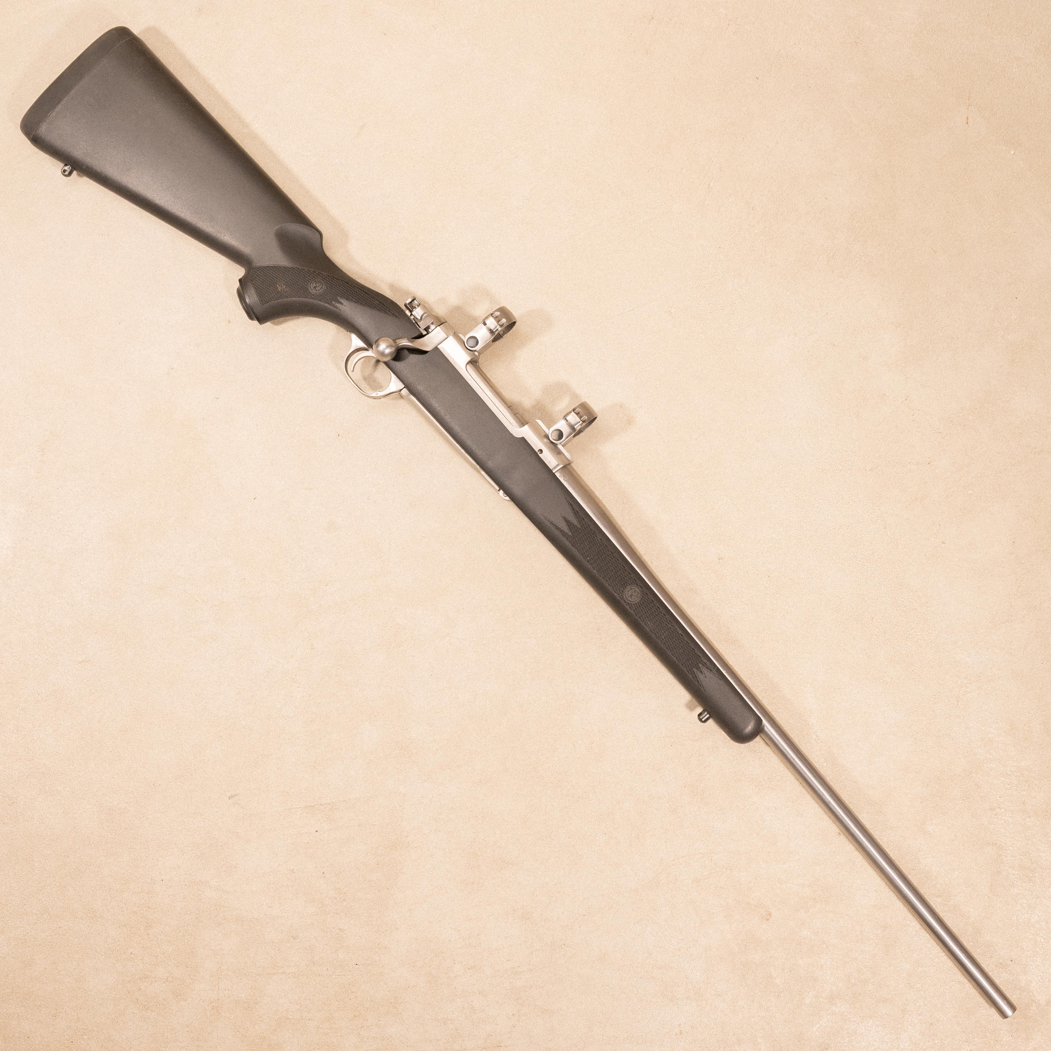 This example is a 2003 production rifle, model 17845, chambered in .222 Remington. It is finished in stainless steel with a black synthetic stock and fitted with a stainless barrel and action. The rifle includes factory Ruger stainless scope rings and reflects its standard configuration with a 22 inch barrel. No original case or additional accessories included.
