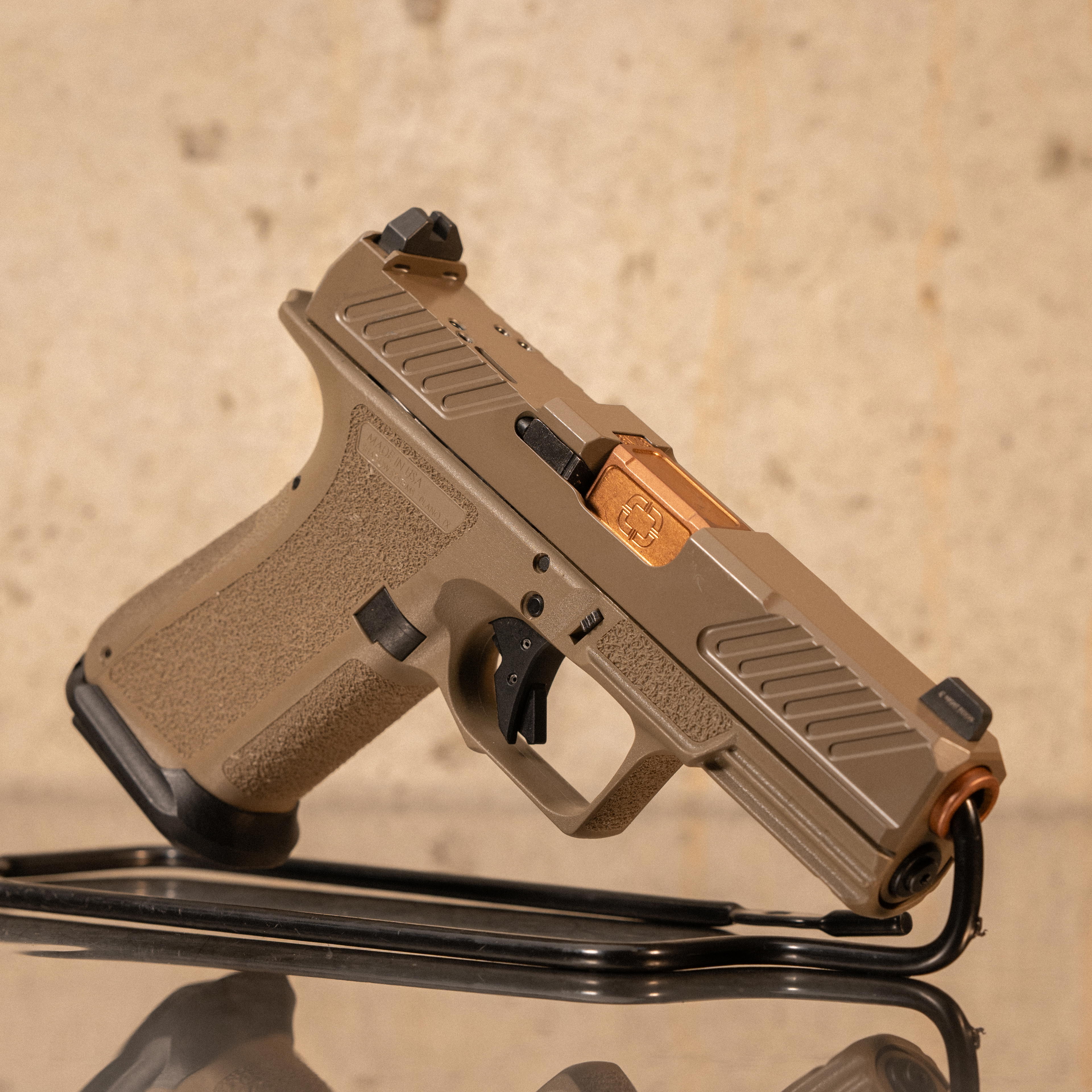 This configuration uses a spiral-fluted bronze match barrel paired with a slide cut for direct mounting of common pistol optics without adapter plates. The slide features front and rear directional serrations, while the polymer frame incorporates an aggressive texture, extended beavertail geometry, and an integrated recoil control ledge. An MR-series magwell is installed to support faster, more consistent magazine changes. The flat-faced trigger and internal components are tuned for a consistent break and reset suitable for defensive or range use. Original bag included. No optics cover plate or additional accessories included.