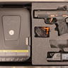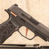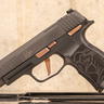 This example features a Nitron finished stainless steel slide with rose gold accented controls, including the trigger, magazine release, and slide catch lever. The polymer grip module is laser engraved with a decorative pattern and is fitted with a manual safety. Sights are SIG XRAY3 day/night sights with a tritium and phosphorescent front dot and a tritium rear U-notch. Accompanied by two 12-round magazines, snap caps, electronic lock box, and original box.
