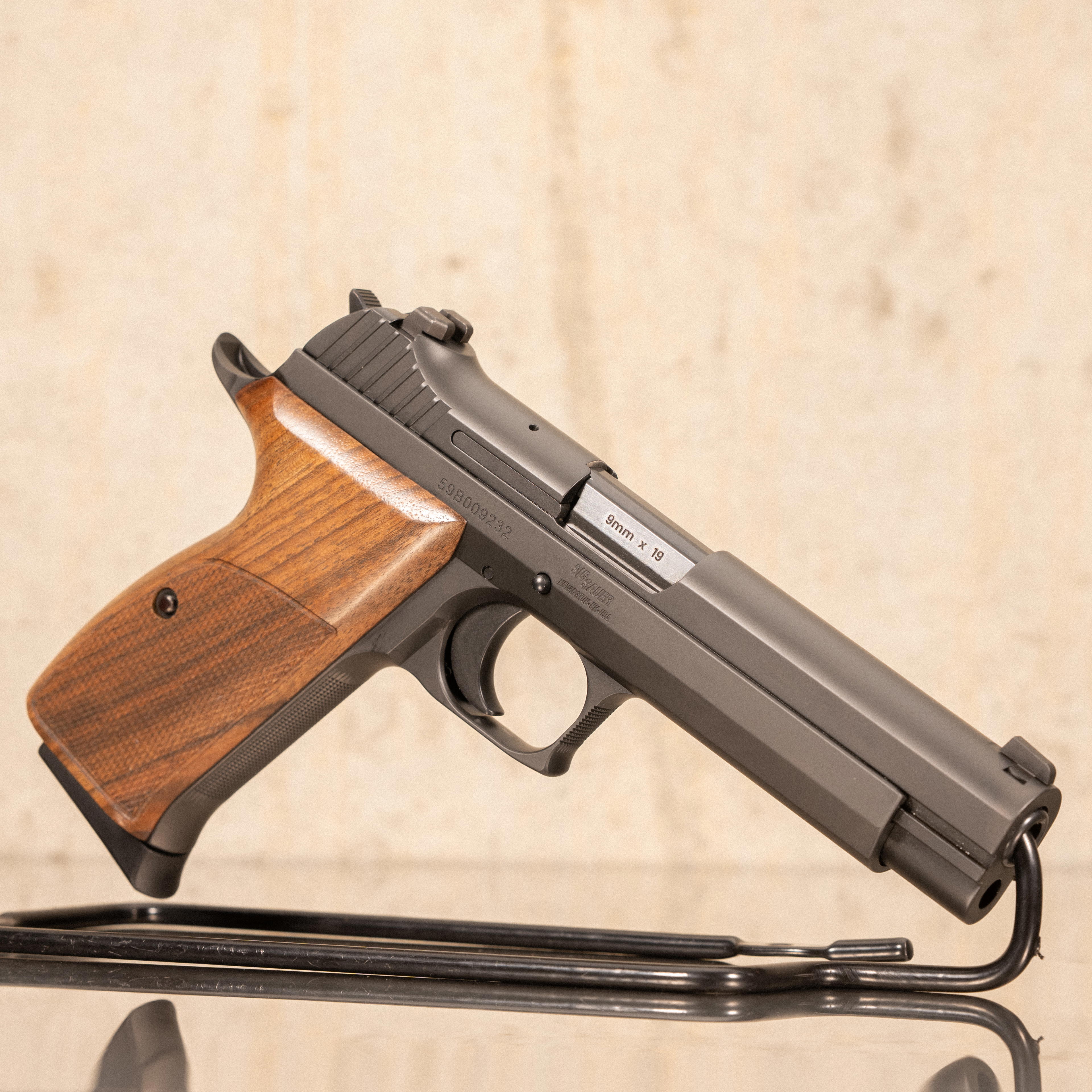 The SIG Sauer P210 is a single action semi-automatic pistol chambered in 9x19, produced by SIG Sauer in Exeter, New Hampshire. The P210 is a modern production continuation of the legendary Swiss SIG P210 design, originally developed by SIG in Neuhausen, Switzerland in the late 1940s. The pistol operates on a short recoil, locked breech system using a Browning type locking mechanism with the slide riding inside the frame rails rather than outside them. This inverted rail arrangement, a hallmark of the P210 design, provides an exceptionally tight slide to frame fit that contributes to the platform's reputation for mechanical accuracy. The Standard model features a 5-inch carbon steel barrel, a stainless steel frame and slide finished in SIG's Nitron coating, manual thumb safety, and an external extractor.