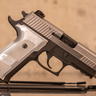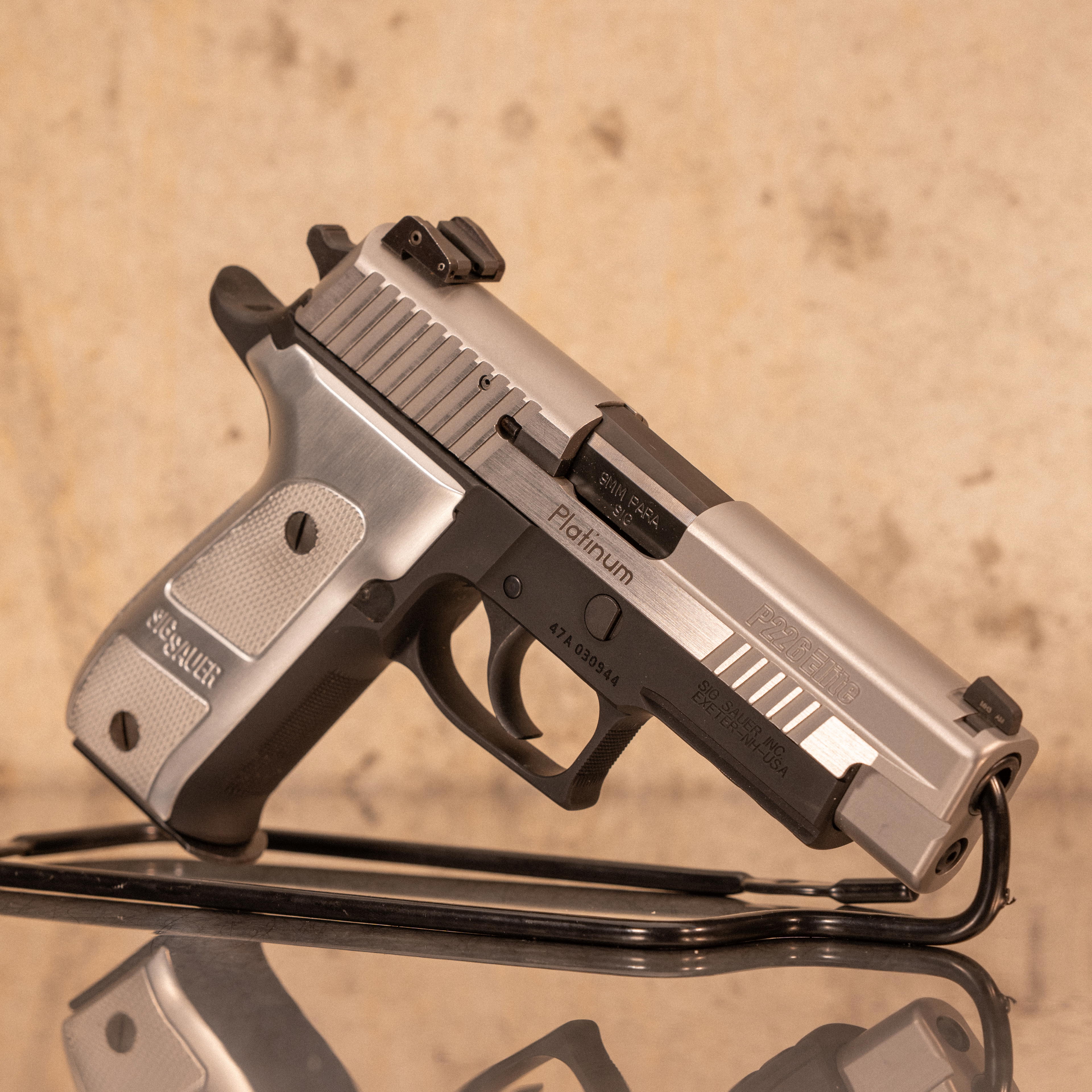 This example features a 4.40 in barrel, stainless steel slide, aluminum alloy frame, and a Short-Reset Trigger (SRT) designed to shorten the trigger reset for faster, repeatable follow-up shots. Night sights are SIGLITE combat adjustable units. Standard capacity for the 9mm configuration is 15 rounds; magazines are steel construction as supplied by the factory. The finish combination and upgraded grip panels distinguish the Platinum Elite from standard P226 variants while maintaining OEM mechanical interfaces. No original case or accessories included.