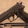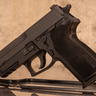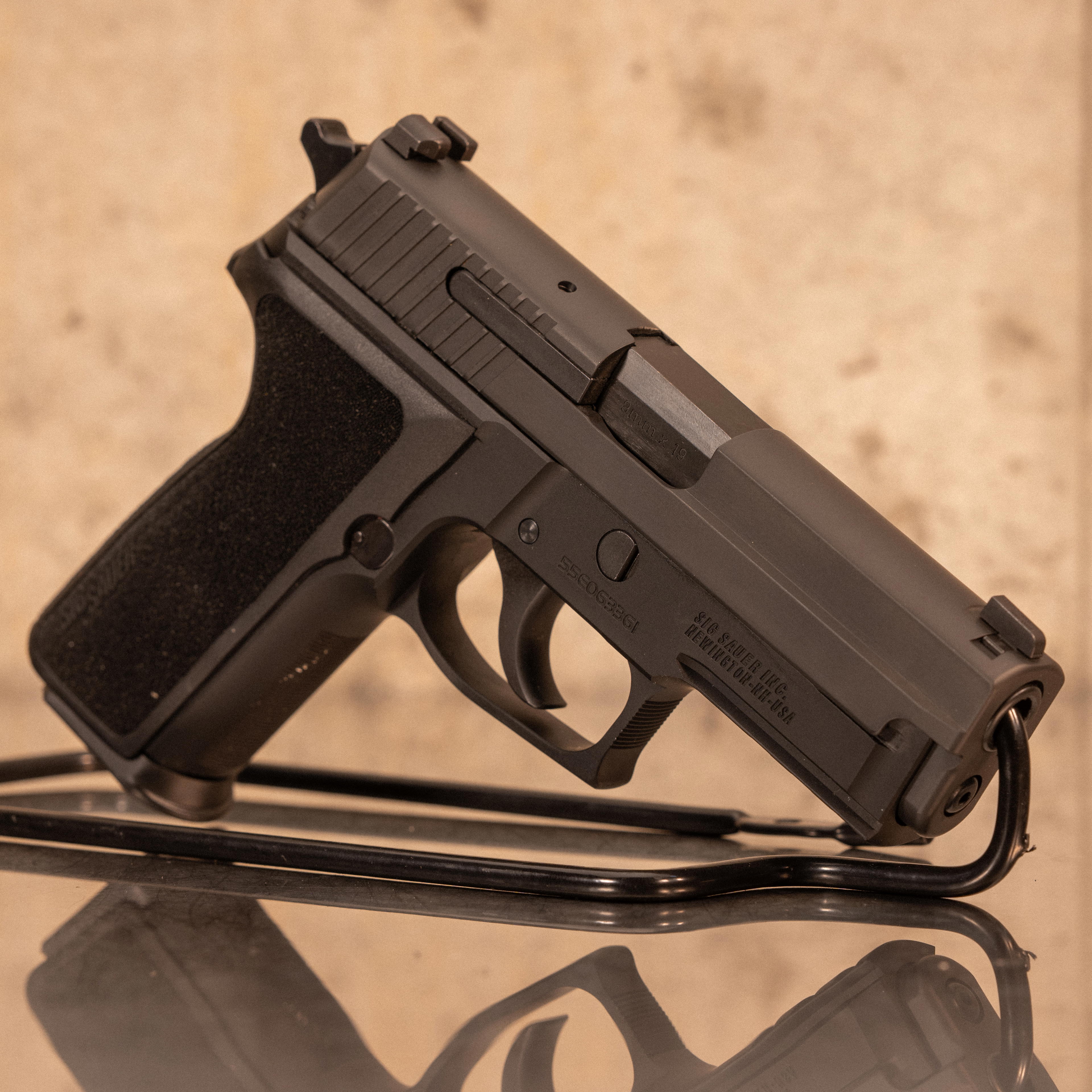 This example pairs a matte black steel slide with an aluminum alloy frame finished with textured polymer grip panels for a secure hold. Controls follow classic P229 ergonomics: decocker, reversible magazine catch, and forward/rear slide serrations for positive manipulation. Sights are fixed three-dot units and the frame incorporates an integral 1913 accessory rail for lights or ancillary devices.
