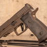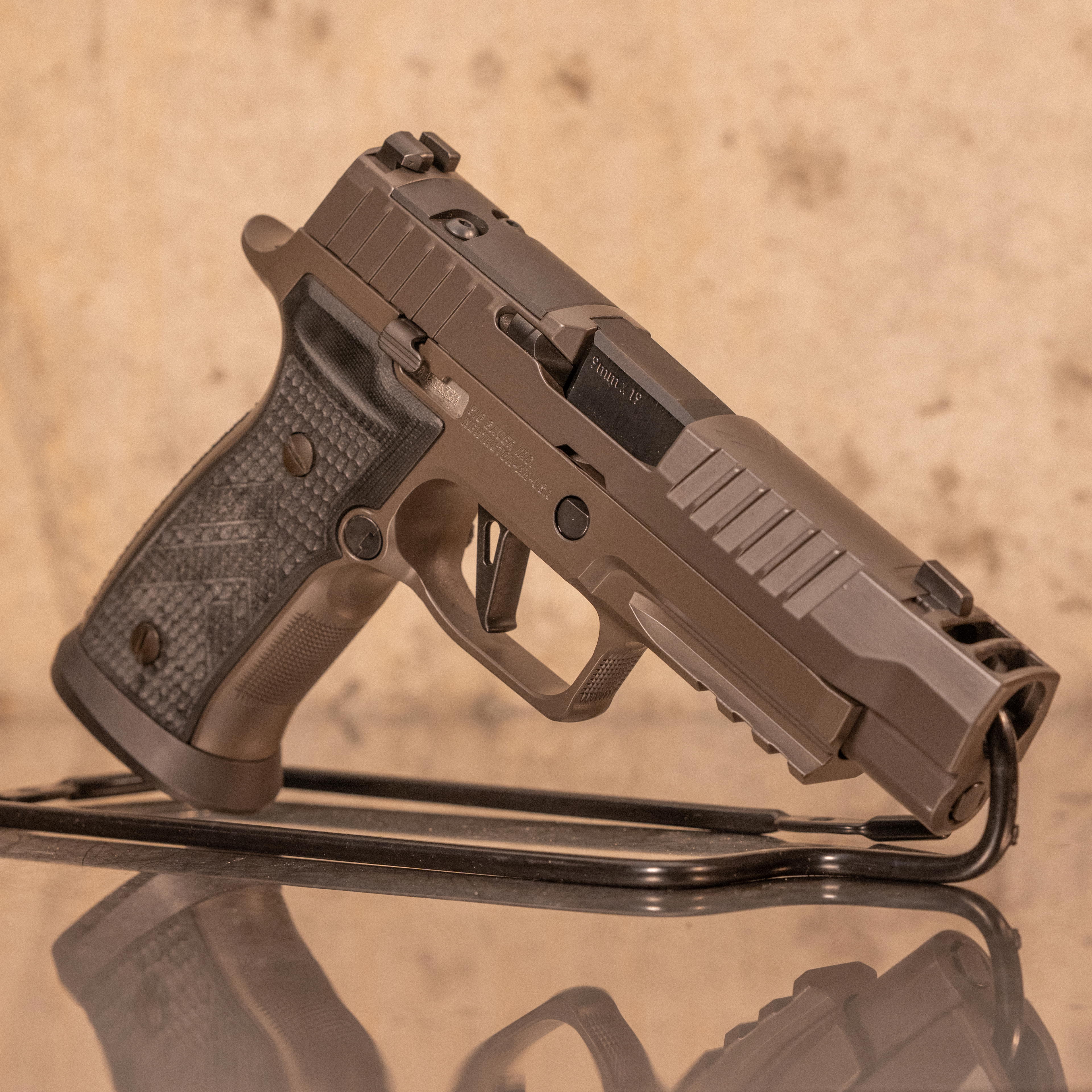 The P320 AXG Legion is a full-size striker-fired pistol built around the modular P320 chassis, with an AXG aluminum grip module to alter mass distribution and slide dynamics for reduced recoil impulse. The Legion series emphasizes a tuned trigger and sighting system intended to improve rapid follow-up shots and repeatable sight acquisition in duty and competition contexts.