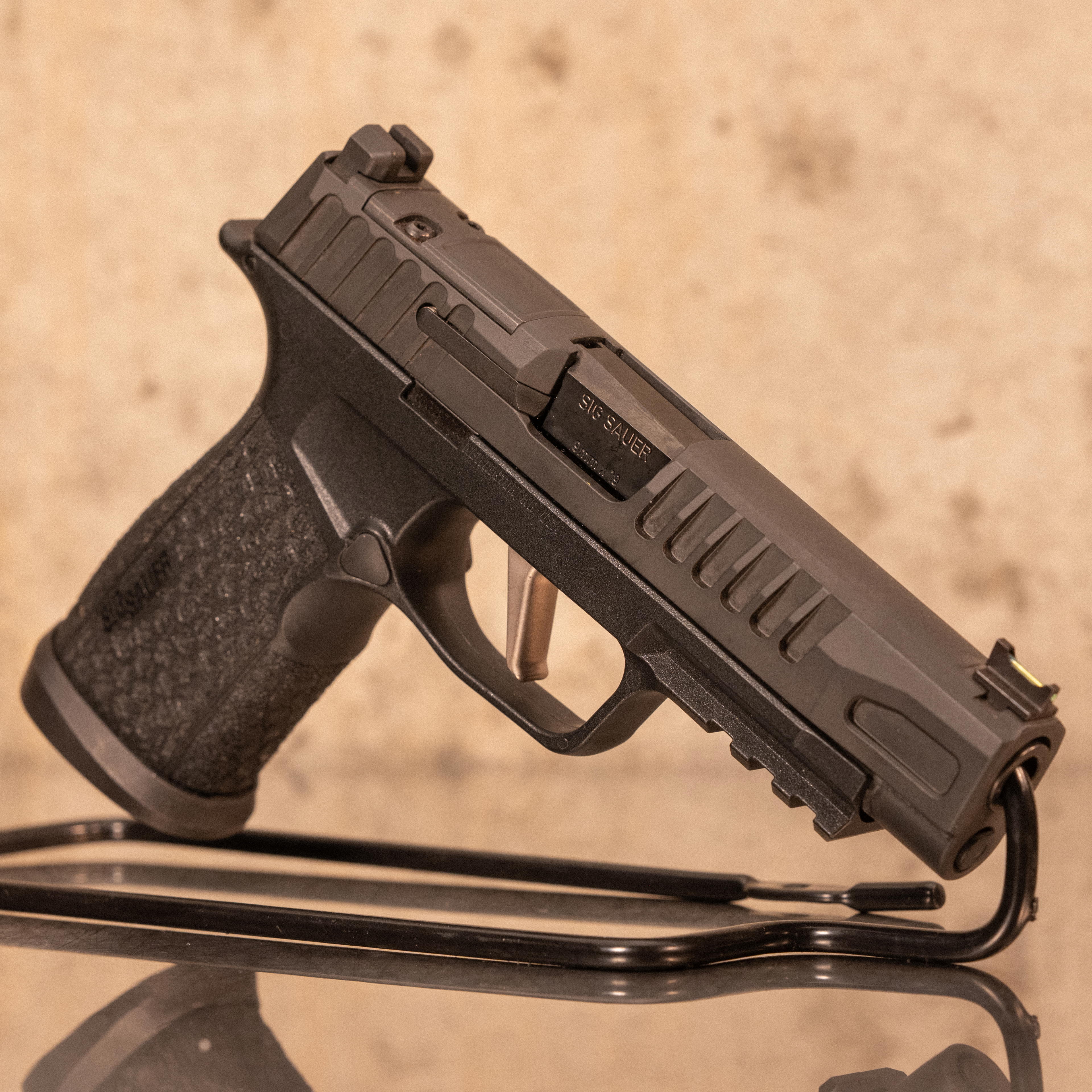 This example is built around a 4.30 inch barrel and a 6 7/8 in optic-ready slide, producing improved ballistic performance and a longer sight radius. Controls are standard P365 layout with a striker-fired action and a nickel-plated flat-faced trigger intended to provide a consistent trigger face and reset. Sights are a fiber optic front paired with a black serrated rear. Capacity is 21+1 to standard Sig Sauer P365X / XMacro-compatible magazines. No original case or accessories included.