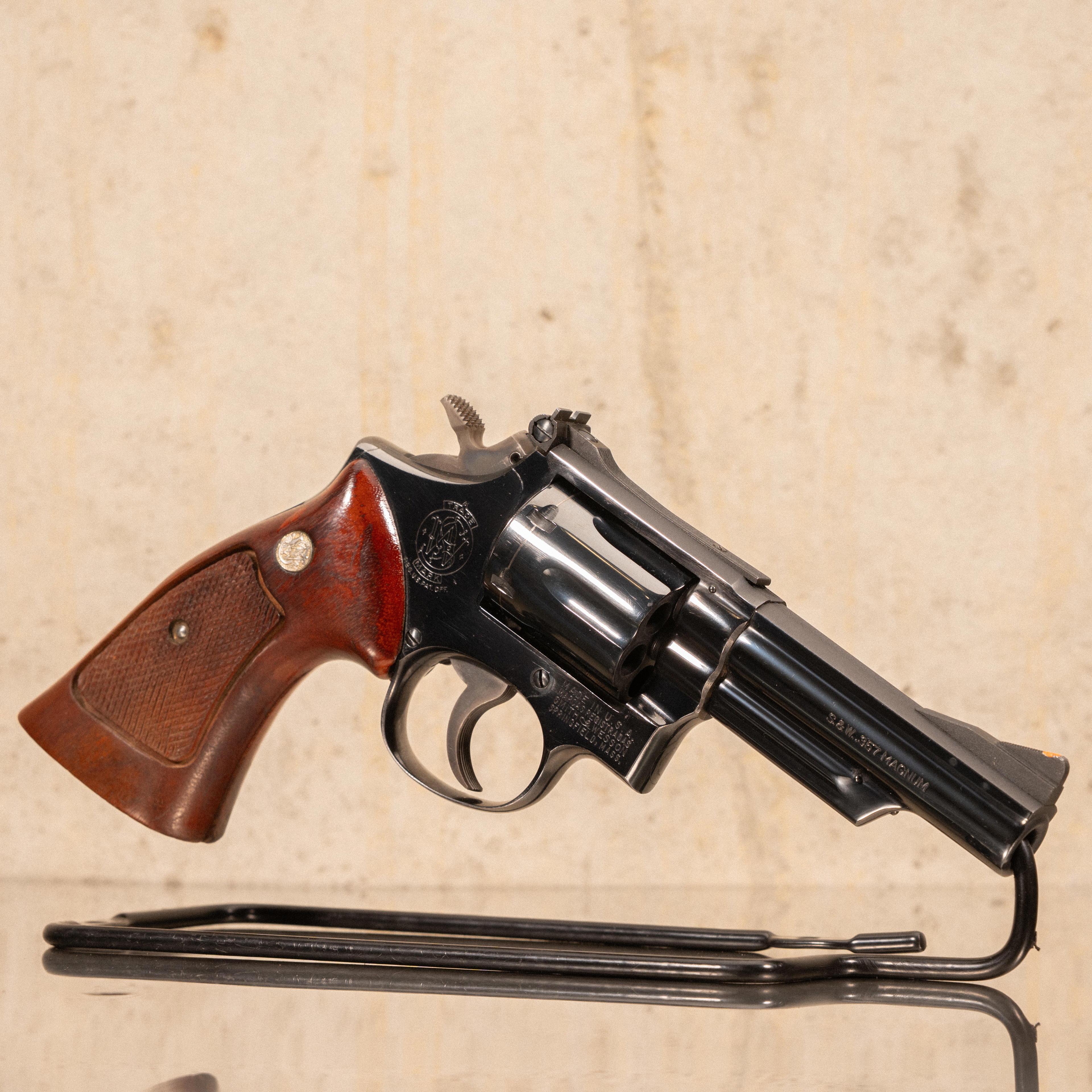 - Grips: Checkered walnut with S&W medallions