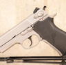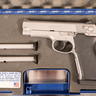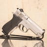 This example features a satin stainless steel frame and slide, black rubber wraparound grips, and a skeletonized hammer. The pistol is fitted with a white dot front sight and a fixed rear sight notch. Controls include a frame mounted ambidextrous decocking lever and firing pin block safety. Accompanied by three 8-round magazines, original box, and manuals.