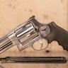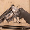 This 4 in stainless steel variant features a factory-installed multi-port compensator to reduce muzzle rise and perceived recoil impulse. The revolver uses an adjustable rear target sight with a fixed front blade, and it is equipped with a black rubber grip to assist with handling under recoil. Standard double-action and single-action operation are retained, with a swing-out cylinder and traditional left-side release. Weight is listed at ~55.6 oz unloaded. No original case, additional compensator, or accessories included.
