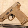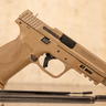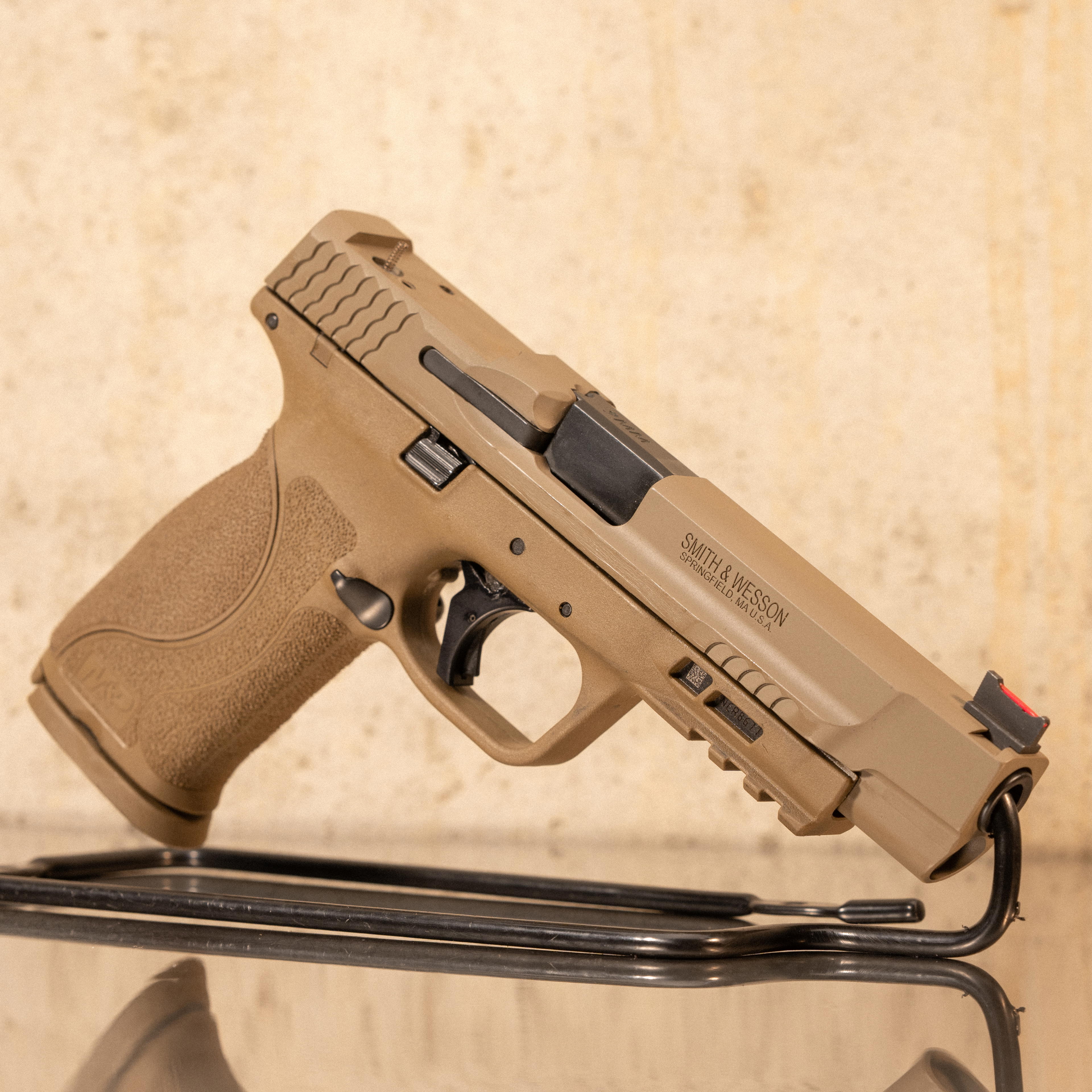 The Smith & Wesson M&P M2.0 5 inch is the long-slide variant of the M2.0 series, configured here with a flat dark earth polymer frame and matching flat dark earth Cerakote finished slide. The slide has been machined and refinished to accept optics using the Leupold DeltaPoint Pro footprint and the pistol is fitted with an Apex curved trigger kit. The 5 inch barrel and extended slide provide a longer sight radius compared to the standard 4.25 inch model while retaining the same full size frame dimensions and magazine compatibility.
