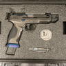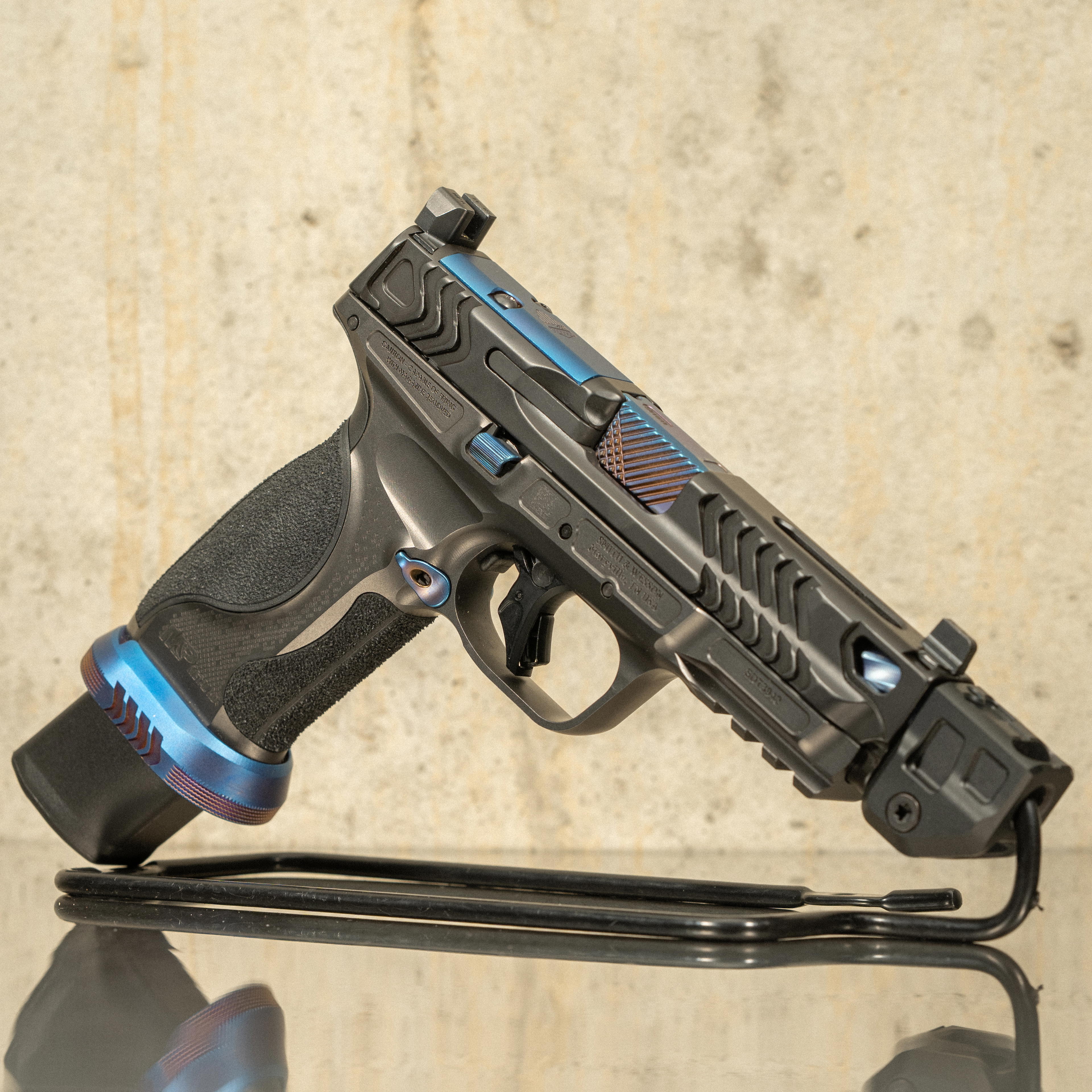This configuration includes a threaded barrel with installed compensator, flat face aluminum trigger, extended steel magwell, and blue PVD accent components on the barrel, controls, and optic cover plate. The pistol is equipped with tall night sights and interchangeable palmswell grip inserts to adjust grip size. Spec Series pistols were packaged as limited edition kits that included a Spec Series knife, commemorative coin, and fitted hard case along with additional accessories.