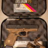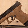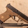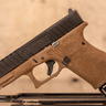 The Glock 19 Gen 5 is a compact service pistol that pairs a reduced-length slide with a full-size style grip to deliver balanced handling and controllable recoil. This example uses a Triarc Frame in FDE to provide an alternate ergonomics package and enhanced grip surface through hand stippling and an undercut trigger guard for higher purchase and improved trigger finger placement.