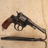 The revolver bears the Imperial Tula Arsenal marking (Императорскій Тульскій) on the frame. The presence of the Imperial arsenal text identifies the revolver as manufactured during the Tsarist production period prior to later Soviet markings, although it appears some of the manufacturing marks have been scrubbed. Accompanied by a holster and lanyard.