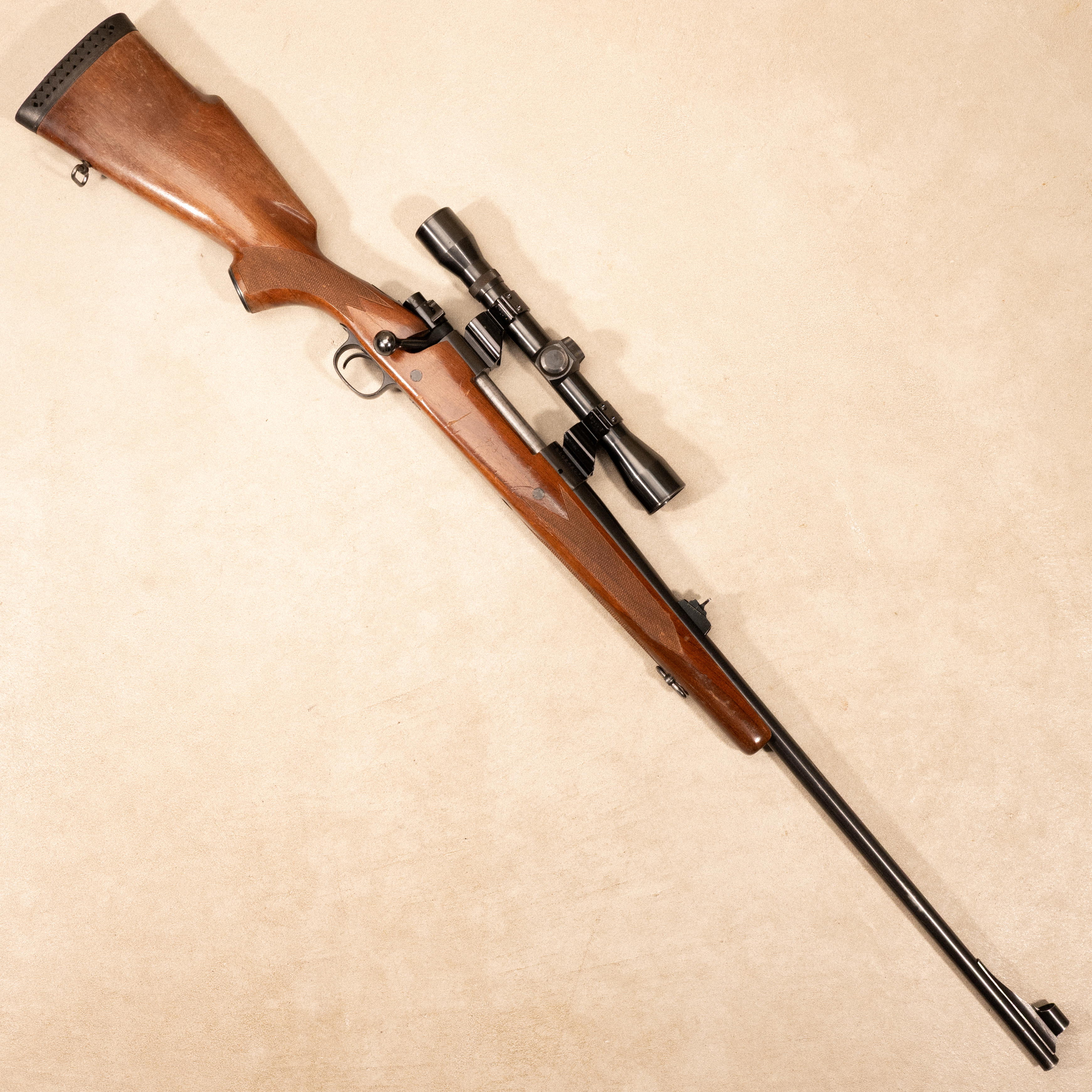This example was manufactured in 1972 and is chambered in .264 Winchester Magnum. The .264 Winchester Magnum chambering was introduced in 1959 as a high velocity, flat shooting belted magnum cartridge driving a 6.5mm bullet at velocities exceeding 3,200 feet per second. A Weaver K4-1 fixed 4x scope is mounted in a Holden Ironsighter see-through mount, positioning the optic high enough to allow unobstructed use of the iron sights beneath it. No original box or accessories included.