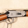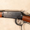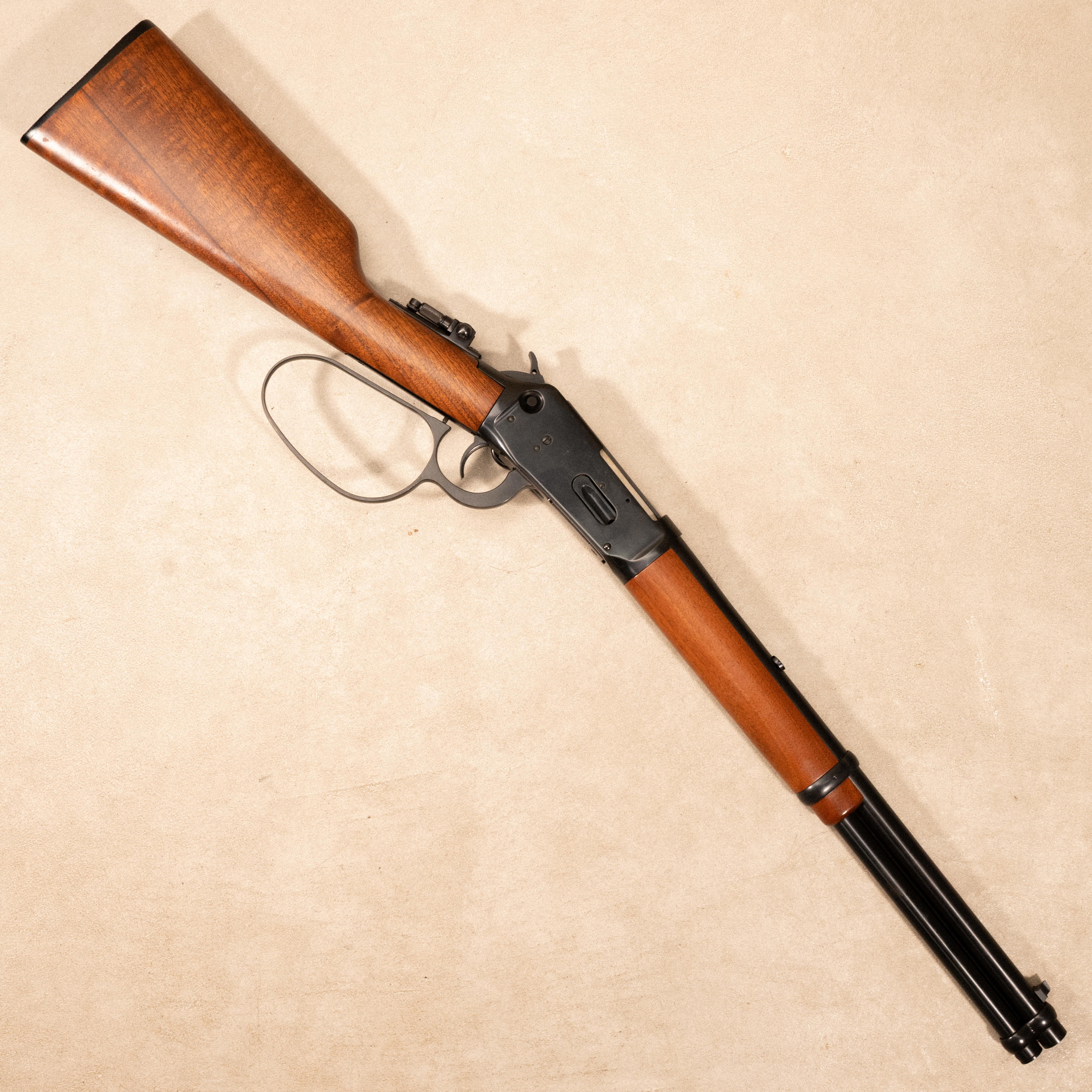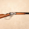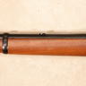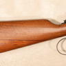 This example is chambered in .45 Colt and features a full length tubular magazine beneath the barrel. The left side of the receiver is fitted with a saddle ring, a traditional feature originally intended for securing the carbine to a saddle via a leather thong. The rear sight is a Lyman tang mounted peep sight paired with a blade front sight. The rifle is equipped with a walnut straight grip stock and walnut forend, and a cross bolt safety. No original box or accessories included.