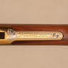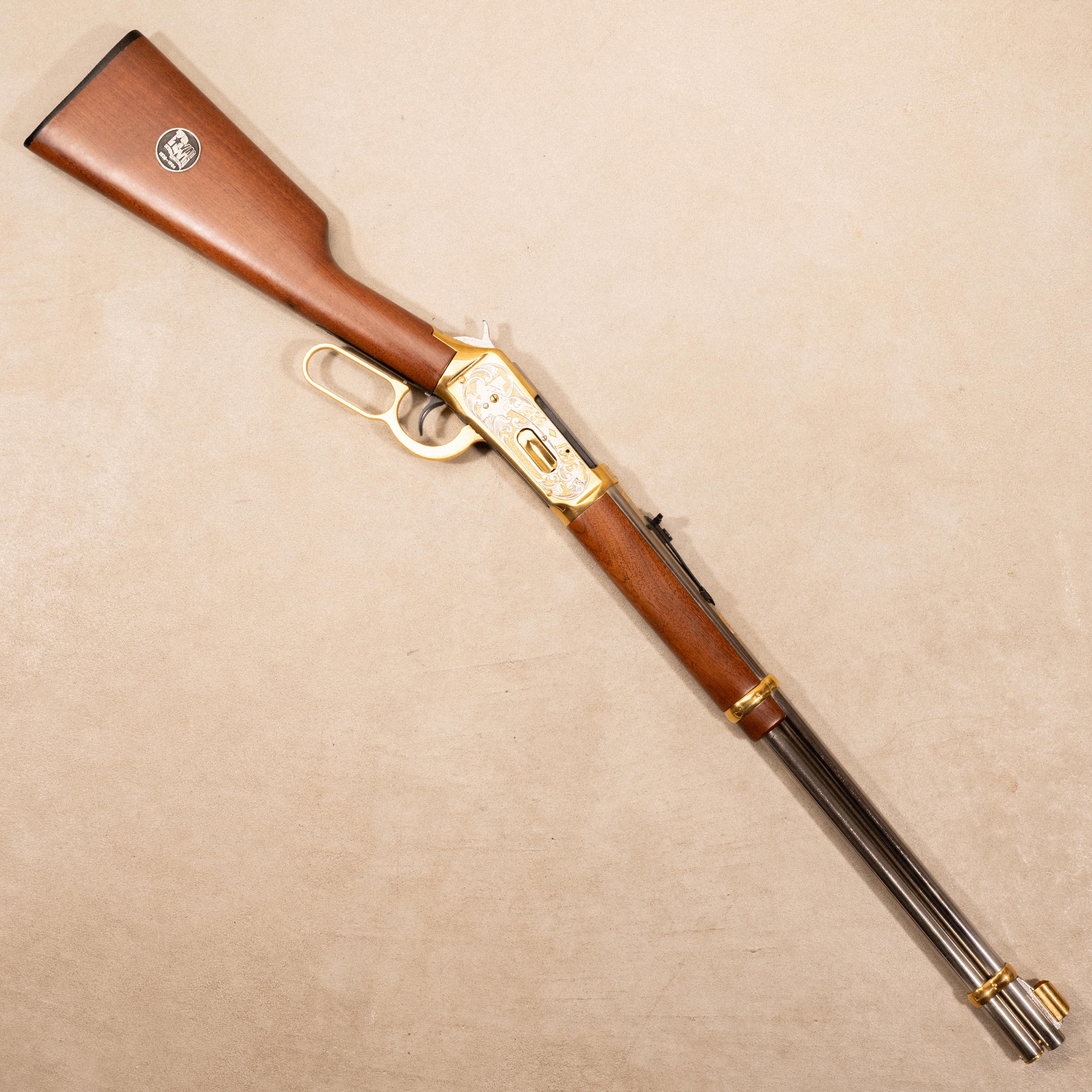 This rifle represents a highly embellished example of that commemorative production. The receiver and lever are finished in a brass tone, contrasted by a silver-tone barrel and engraved panels secured with brass screws. The left side of the receiver is engraved “TEXAS Sesquicentennial,” while the right side features the outline of the State of Texas containing “Texas 1836–1986.” The top of the barrel is engraved “Silver ★ Series,” and the tang is marked “Mercedes TX.” Ahead of the chamber the rifle is marked “1 of 3” indicating extremely limited production associated with this specific variation.