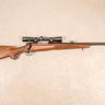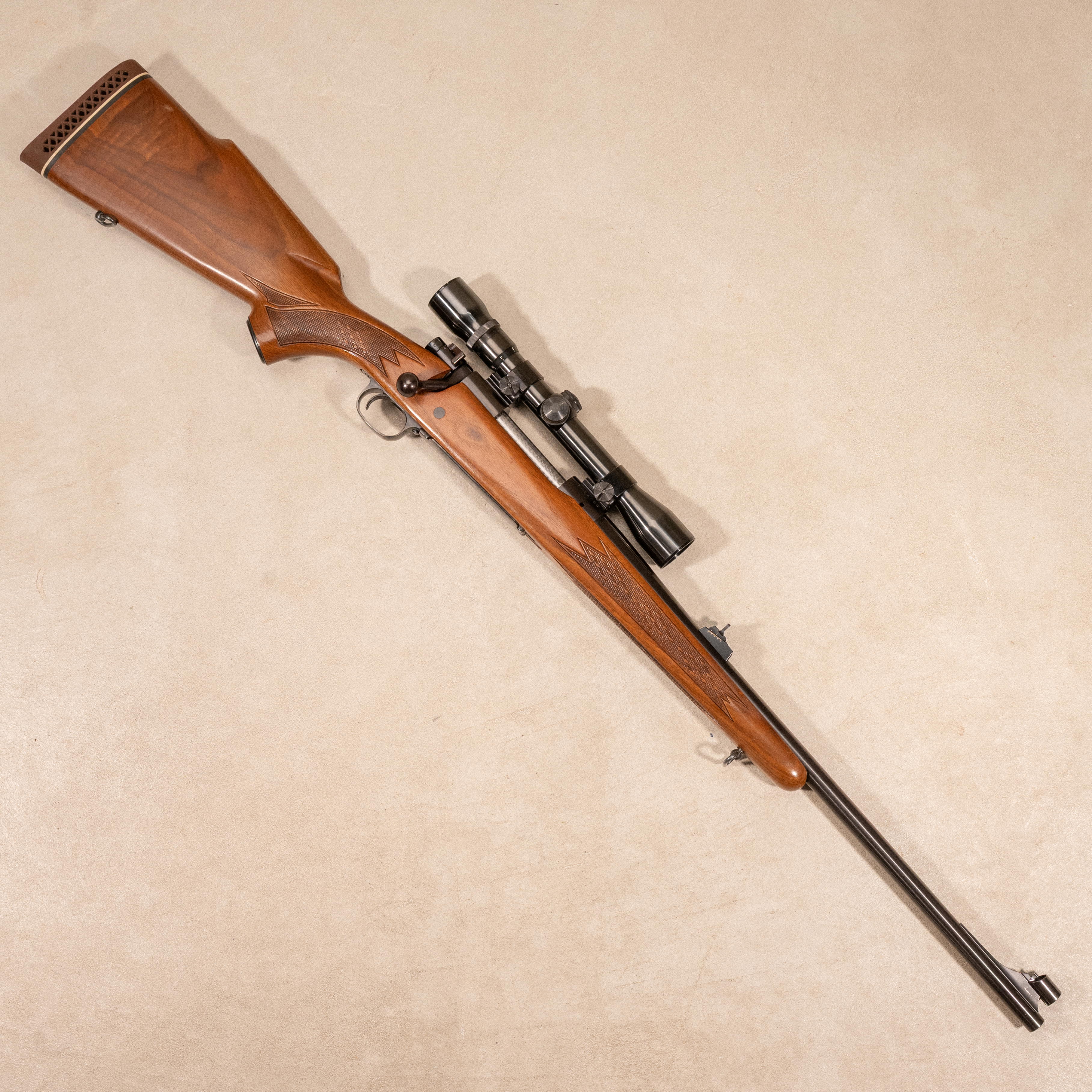 This example was manufactured in 1971 and is chambered in .30-06 Springfield. The rifle is fitted with a hooded ramp front sight and a semi buckhorn rear sight. The walnut stock features a Monte Carlo comb with a left side cheekpiece and diamond point checkering on the grip and forend. The rifle is accompanied by a Weaver V7-A 2.5-7x variable power scope. No original box or accessories included.