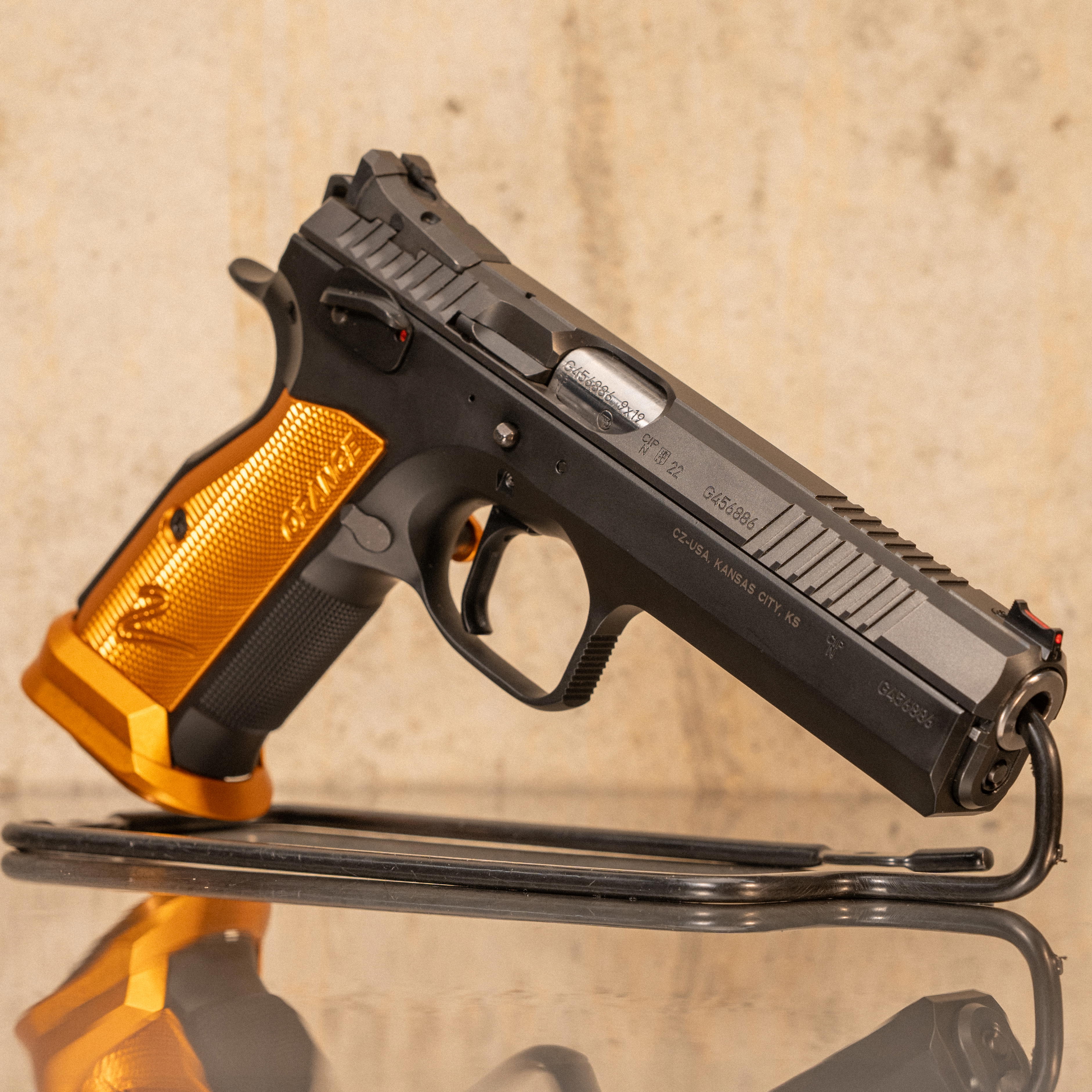 The CZ TS2 Orange is a steel-frame 9x19 single action competition pistol built on the Tactical Sport platform and configured for practical shooting disciplines. The pistol features orange aluminum grip panels, extended controls, and the factory TS2 Orange configuration. Original box and accessories included.