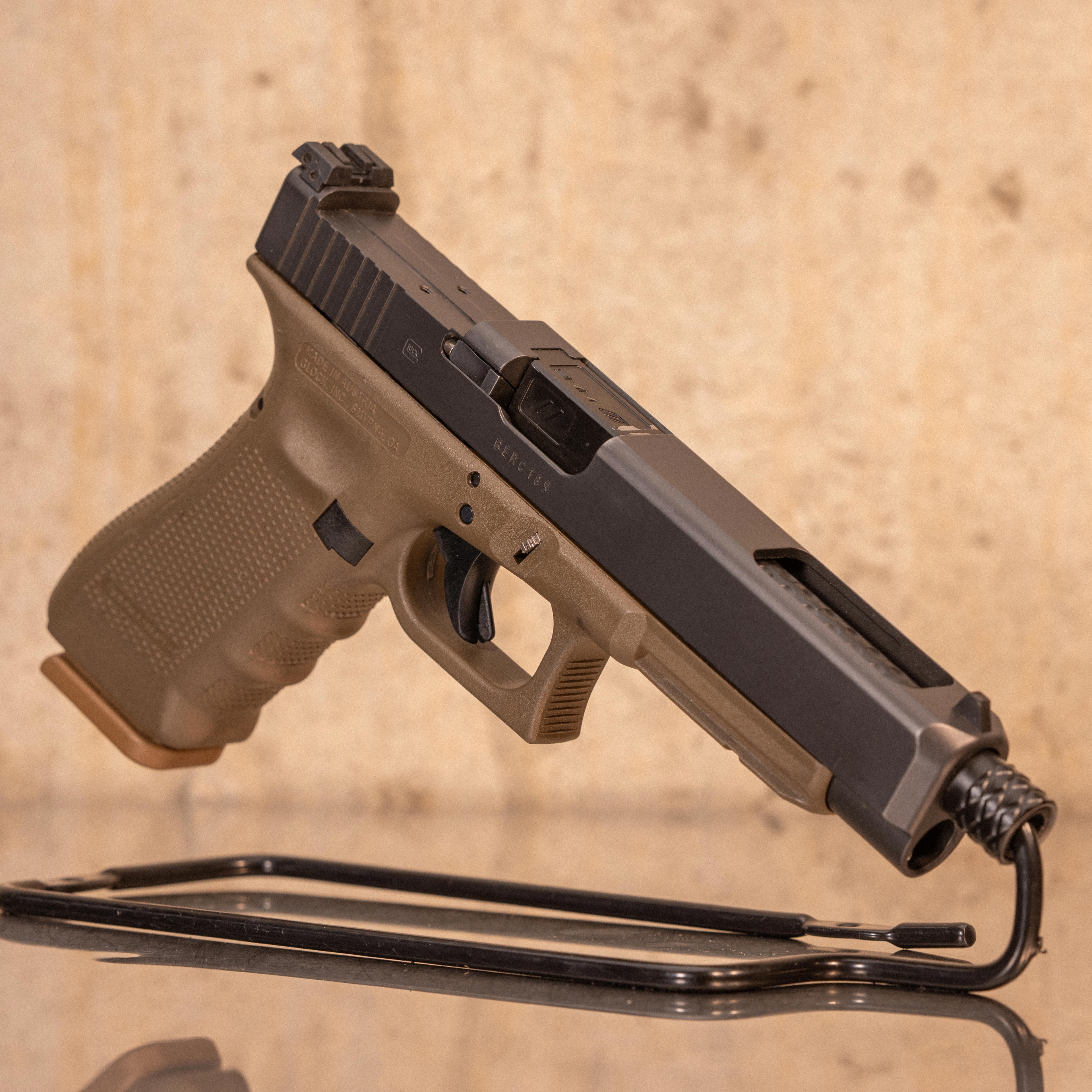 Glock 17 Gen 5 chambered in 9×19mm, Cerakote tan frame and slide, and a DeltaPoint Pro footprint Triarc Gen 4 slide. Striker-fired Safe Action platform with a professionally stippled frame and threaded Triarc barrel. No box or accessories included.
