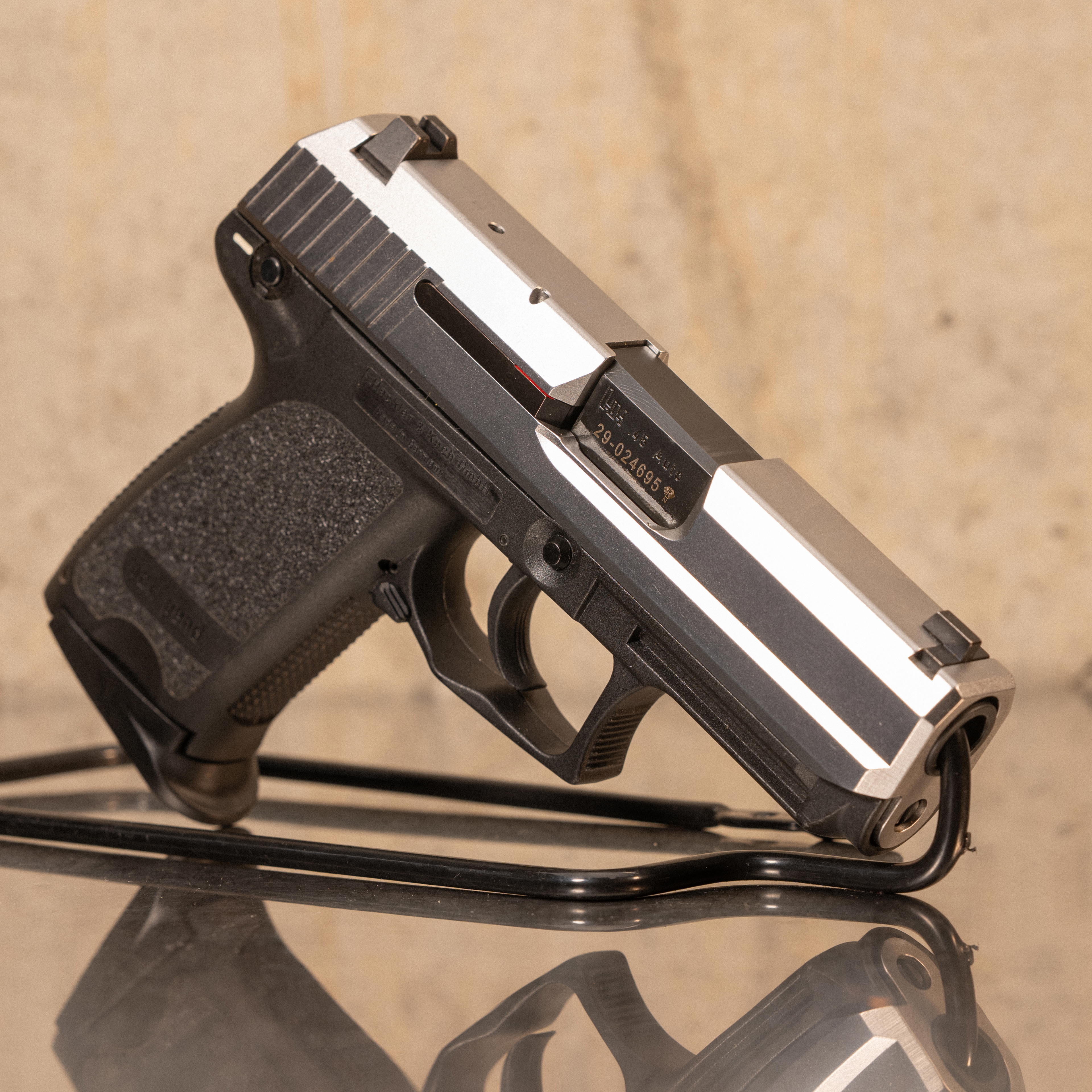 Heckler & Koch USP Compact chambered in .45 ACP with a 3.8-inch barrel and stainless steel slide. Features polymer frame with accessory rail, double action/single action operation, and two magazines.