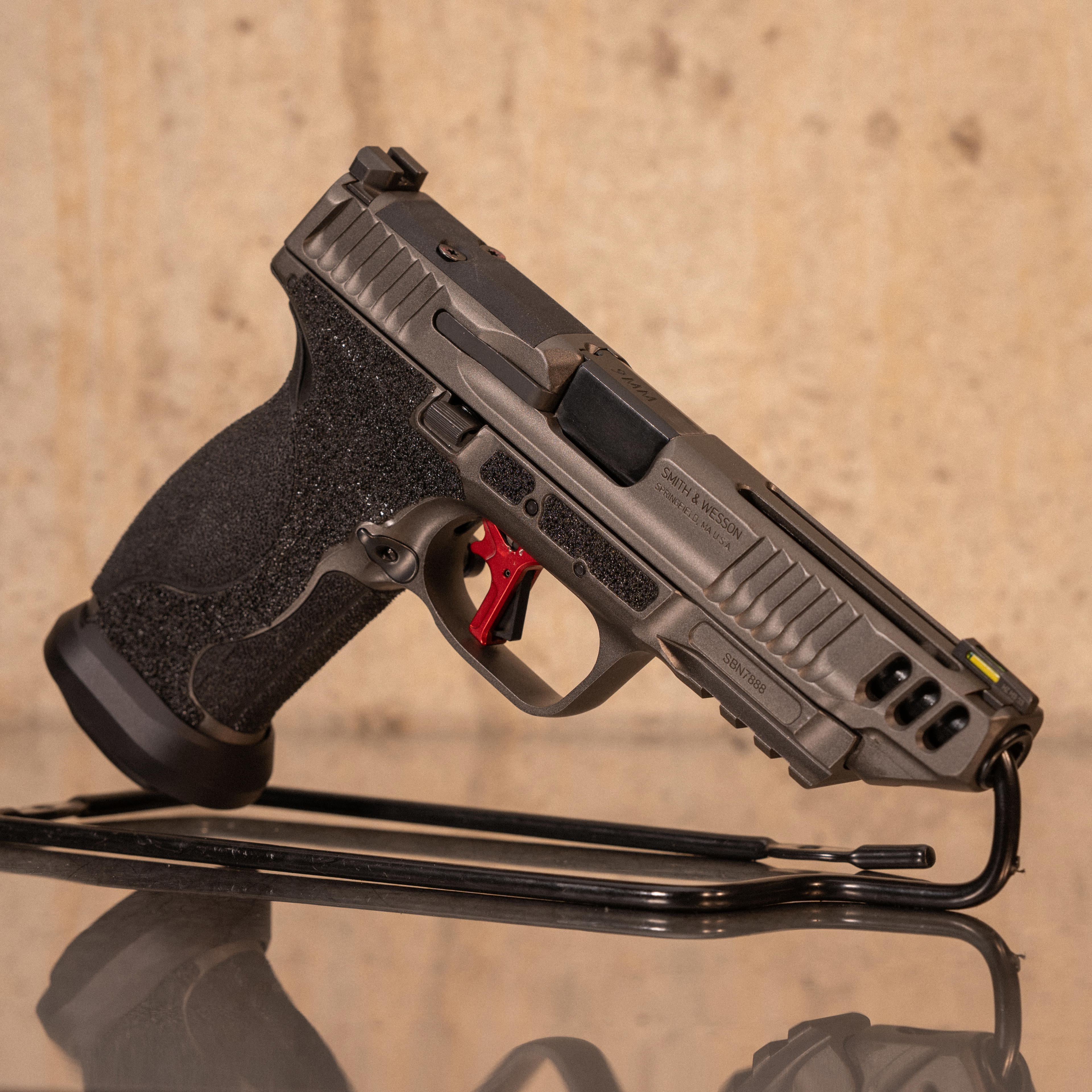 Smith and Wesson M&P M2.0 Competitor chambered in 9mm with a 5.0 in barrel, ported slide, and aluminum-framed competition configuration. Equipped with an Apex flat-faced trigger for a consistent trigger press and rapid reset.