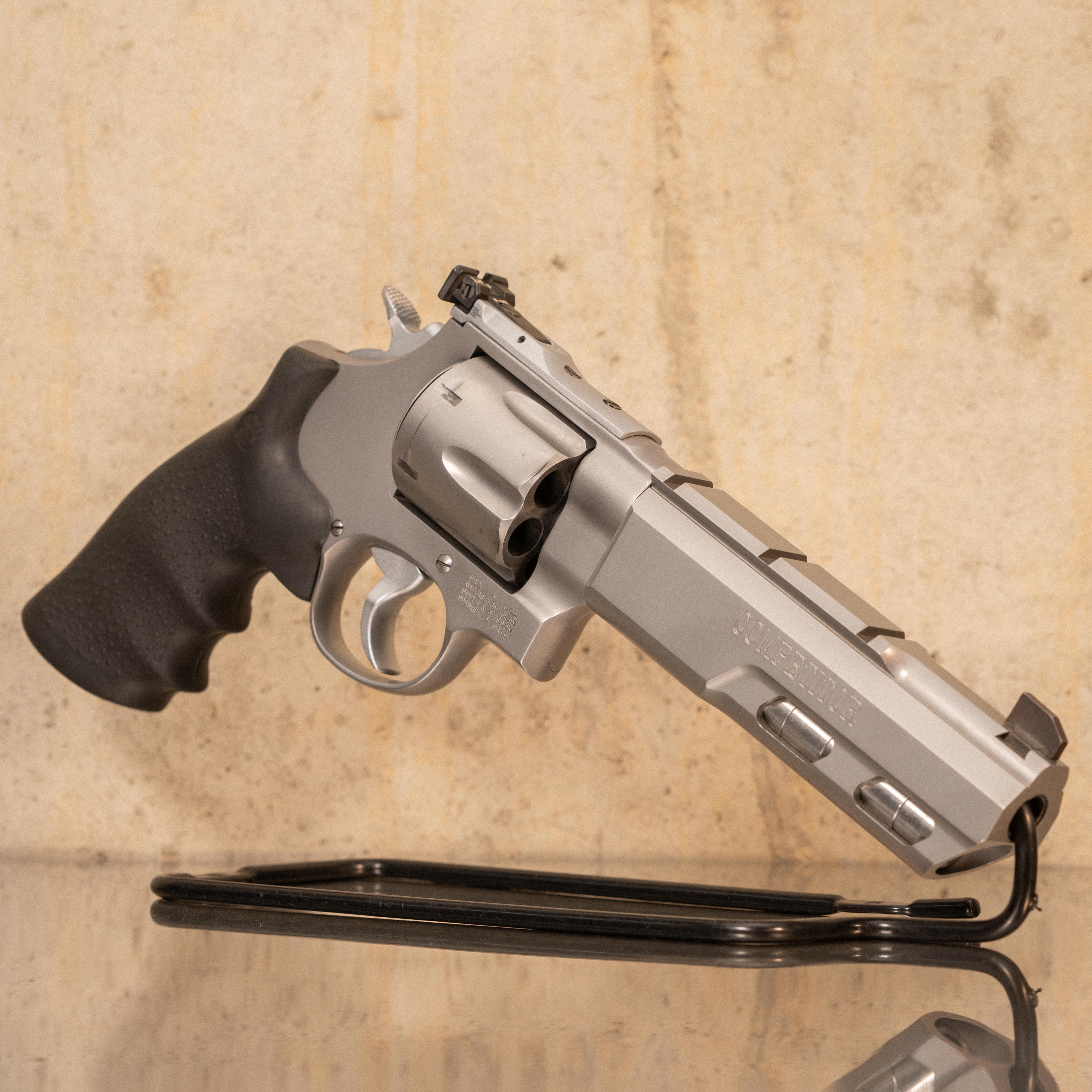 The Smith & Wesson Model 629-6 Competitor is a stainless steel double action revolver chambered in .44 Magnum. The Competitor variant features a slab-sided barrel with removable barrel weights and an adjustable rear sight. No original box or accessories included.
