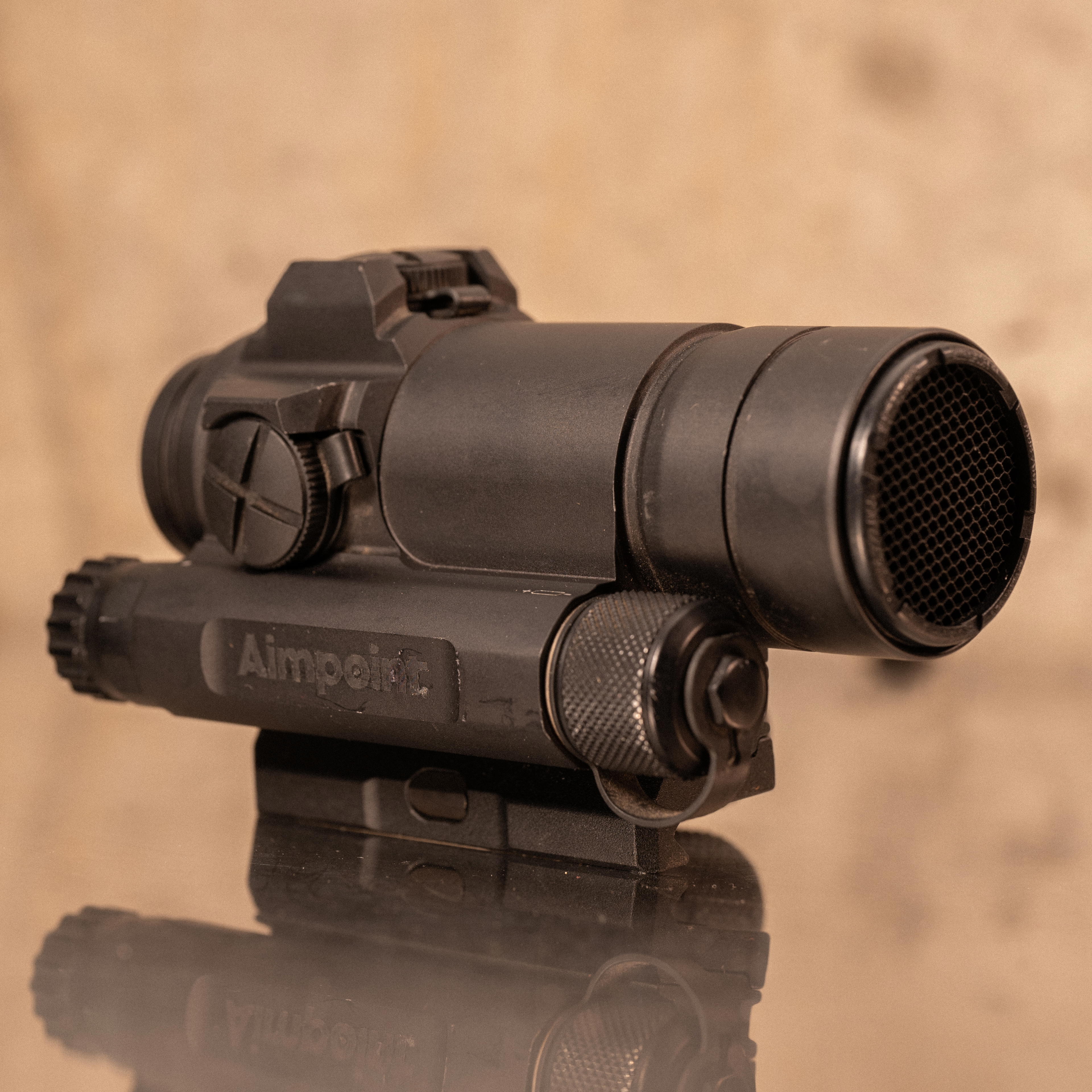 Aimpoint Comp M4s red dot sight with a 2 MOA reticle, QRP2 mount, and anodized black aluminum housing. Powered by a single AA battery with extended runtime, equipped with a Tenebraex 30mm screw-in killFLASH ARD for glare reduction. No original box included.