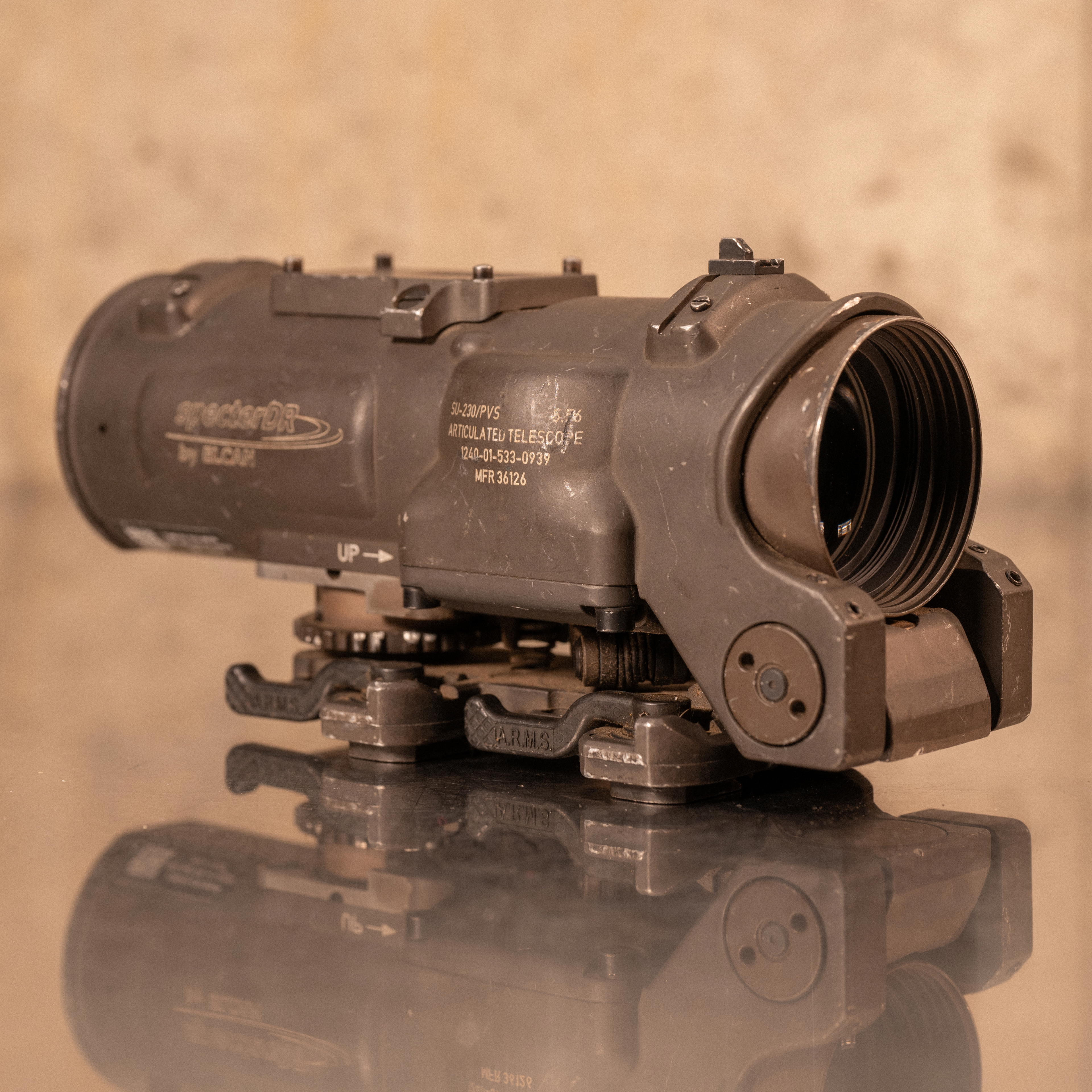 Elcan SU-230 HD prism sight with a linear BDC reticle, dual-role 1×/4× magnification, and a matte Flat Dark Earth finish derived from military SOCOM contract variants. Heavy-Duty (HD) build standard with piggy-back MRD red-dot mount (P/N #902995). No original packaging or additional accessories included.
