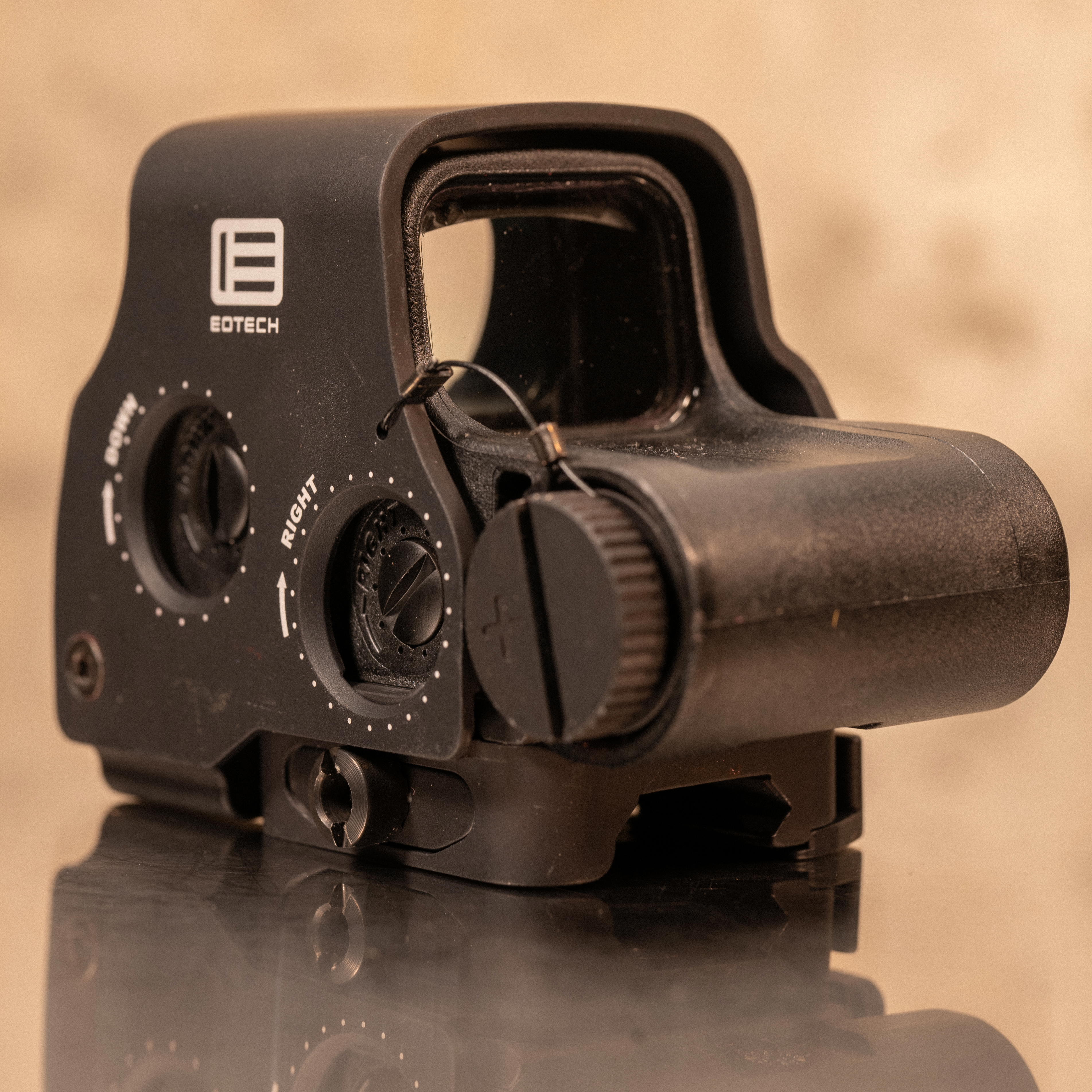 Military-contract holographic sight built to the highest acceptance standard EOTech performs, identical in layout to an EXPS3-0 but with a steel tie-down lug and a machined relief that clears raised UID plates. These units are contract overruns—rarely available to the public. Ships with one installed CR123 battery; no box or accessories.