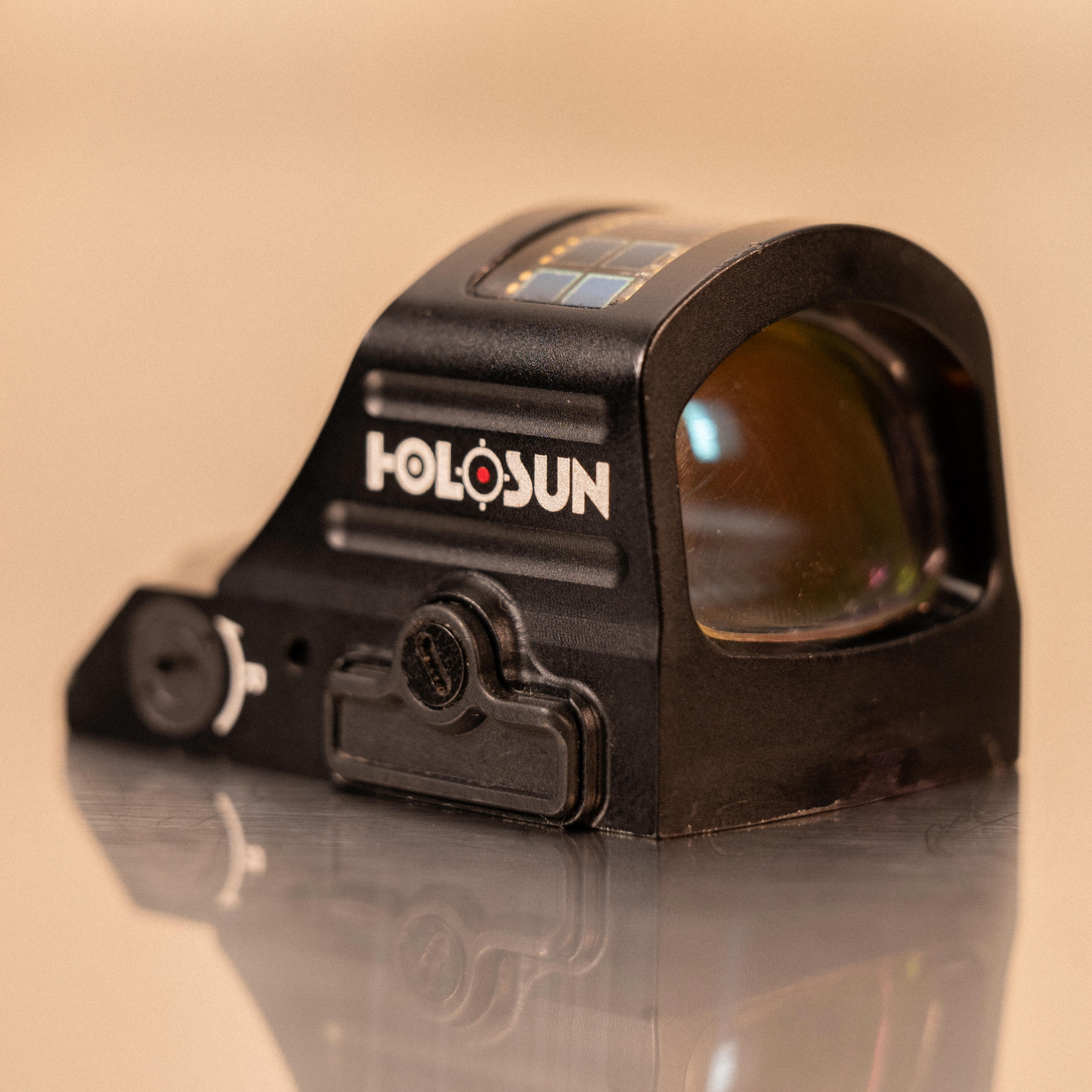 Holosun 507Comp red-dot with a 2 MOA dot / 32 MOA circle multi-reticle, 7075-T6 aluminum housing, and a compact competition profile. Solar Failsafe and Shake Awake power management, sliding CR1632 battery tray for tool-free changes.