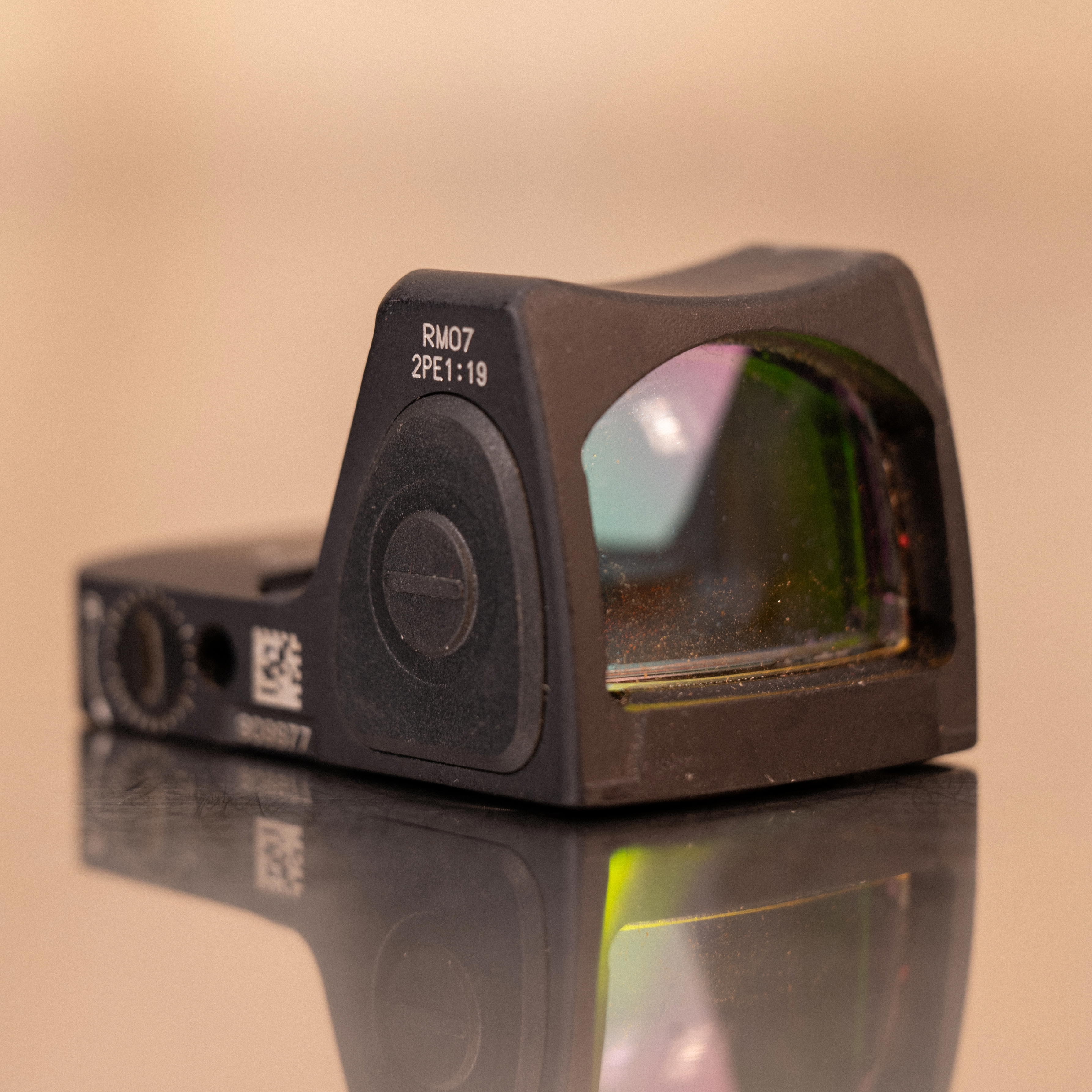 Trijicon RMR Type 2 RM07 reflex sight with 6.5 MOA red dot, forged aluminum housing, and adjustable LED brightness controls. Designed for direct mounting or adapter use with compatible handgun slides, rifles, or optics mounts. No original box included.
